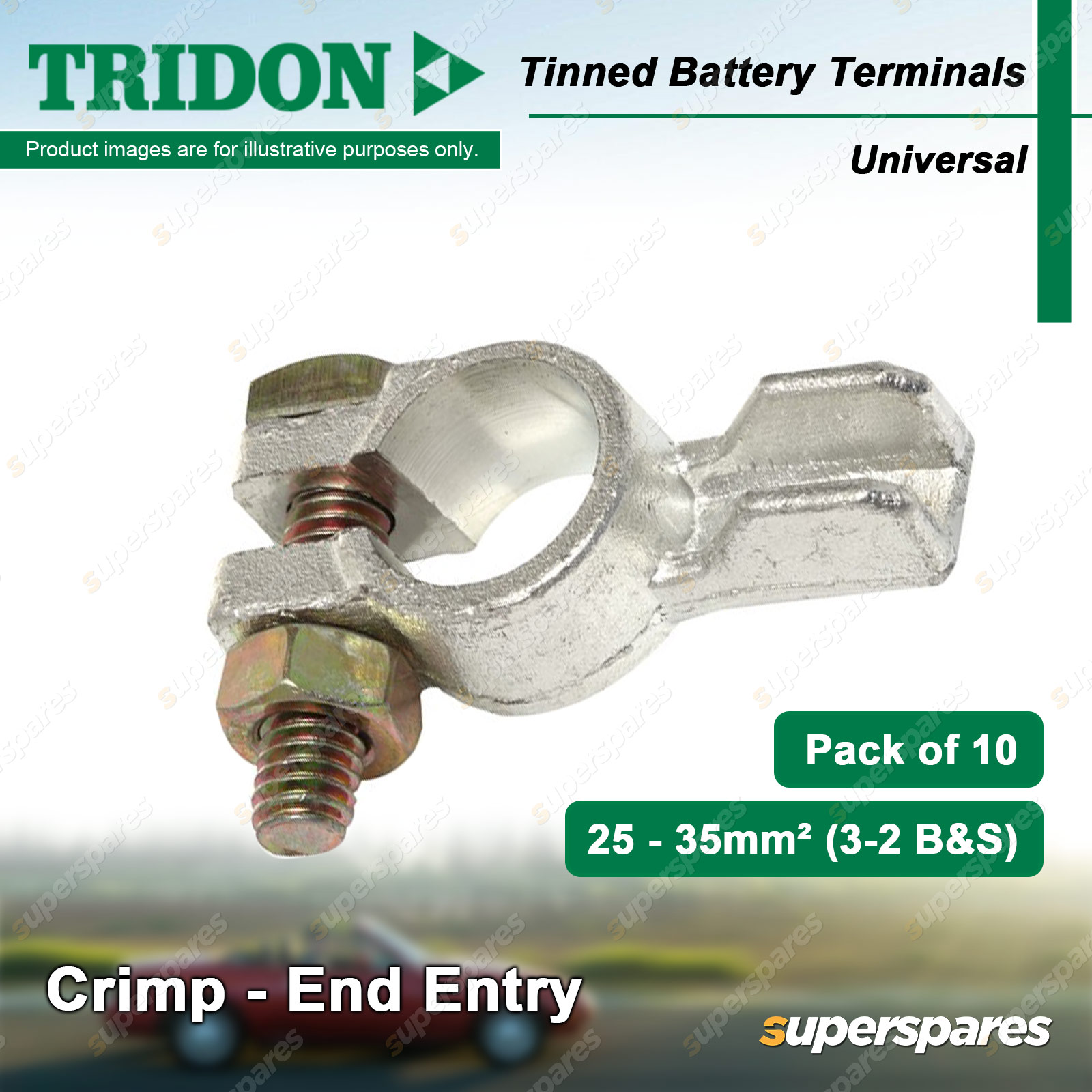 Content : Tridon Battery Terminals Finish : Tinned Terminal Type : Crimp - End Entry Post Type : Universal (U) Quantity : 10 Packaging : Boxed |