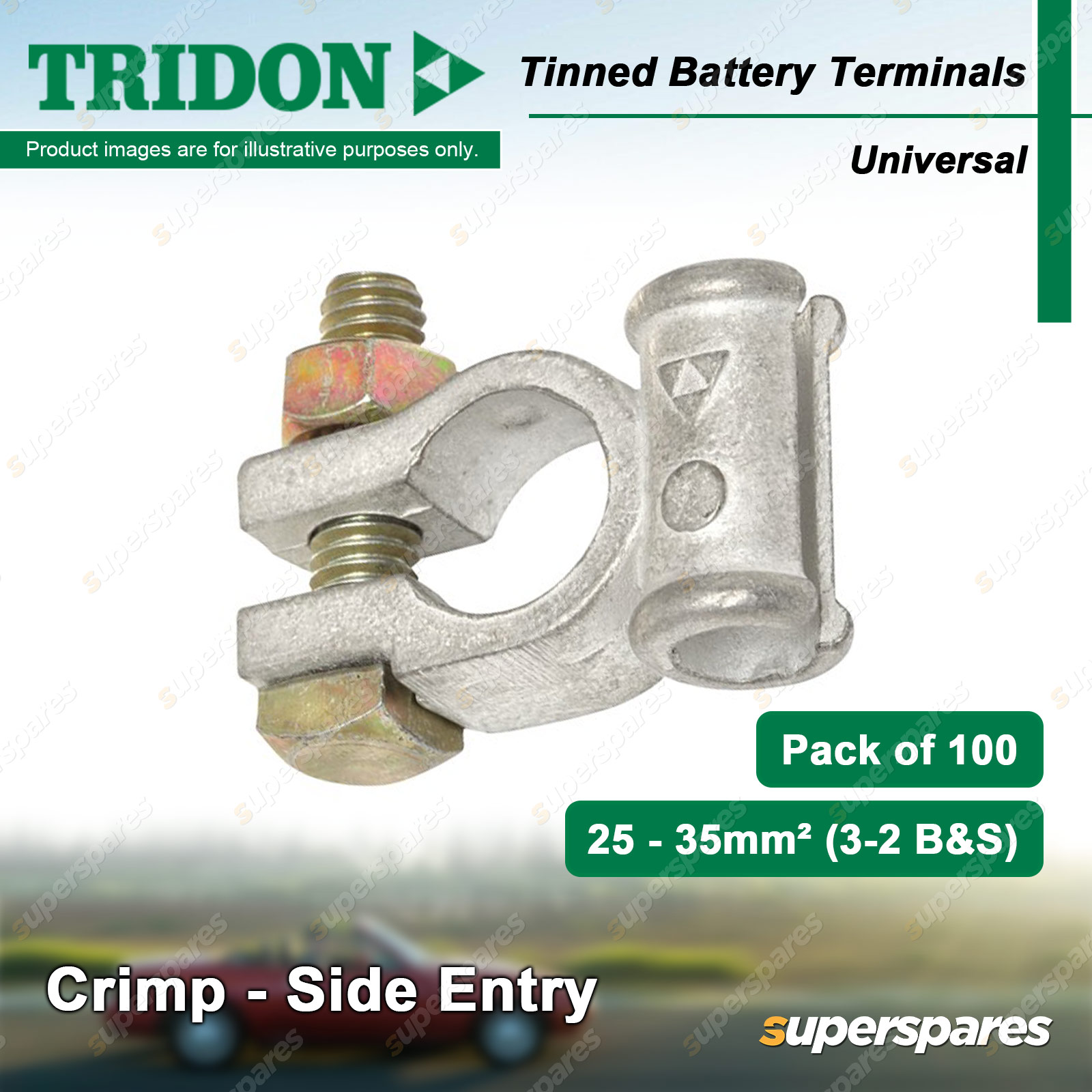 Content : Tridon Battery Terminals Finish : Tinned Terminal Type : Crimp - Side Entry Post Type : Universal (U) Quantity : 100 Packaging : Boxed |