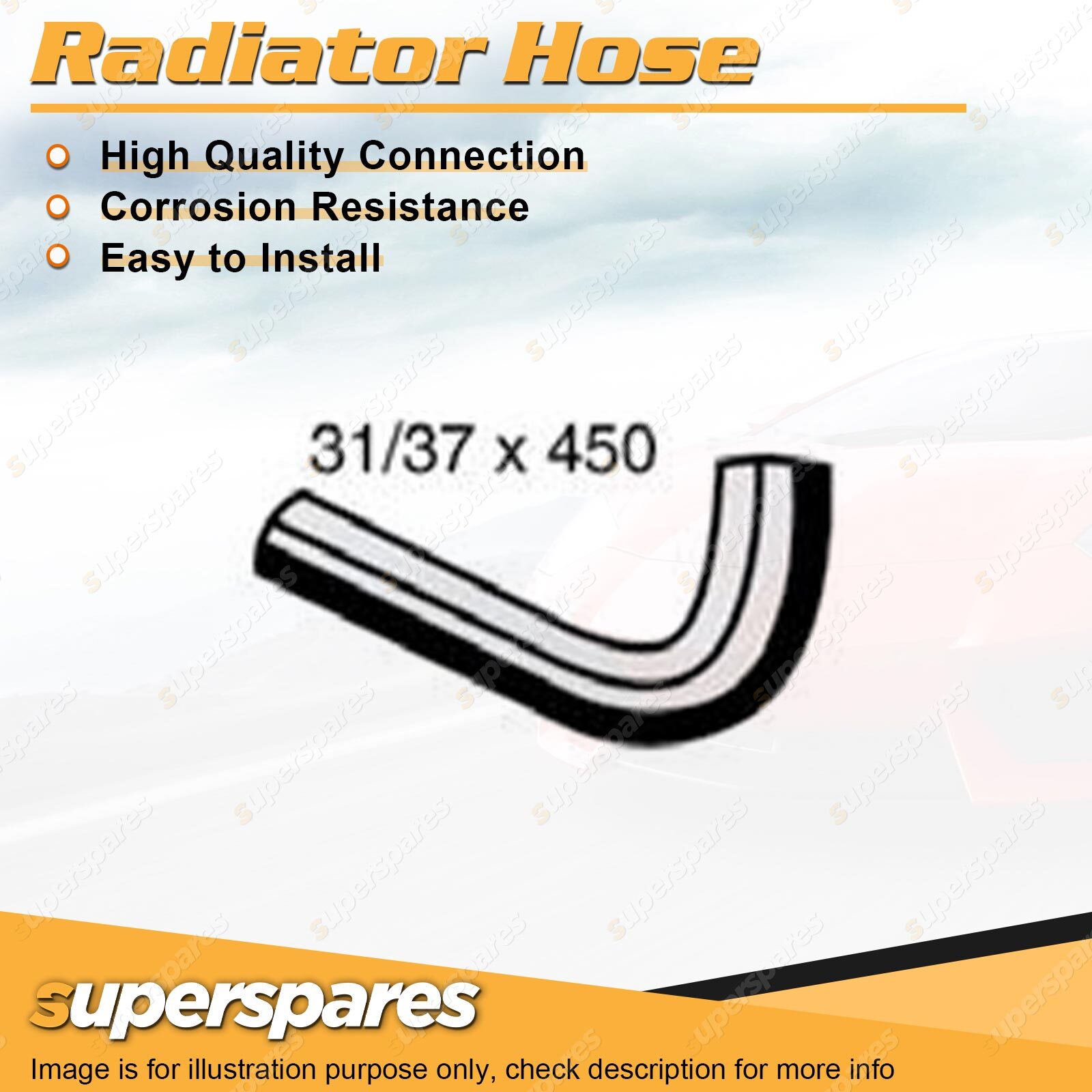 Content : 1 x Radiator Hose Brand : Superspares Position : Upper | Parameter : Length : 450mm Inside Diameter : 31mm Bell Inside Diameter : 37mm |