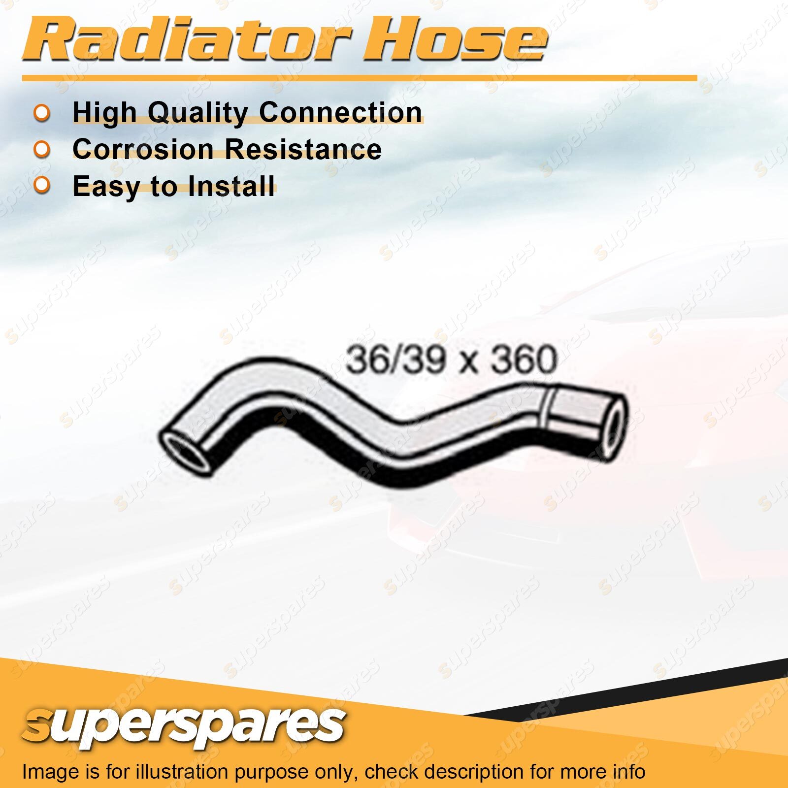 Content : 1 x Radiator Hose Brand : Superspares Position : Upper | Parameter : Length : 360mm Inside Diameter : 36mm Bell Inside Diameter : 39mm |