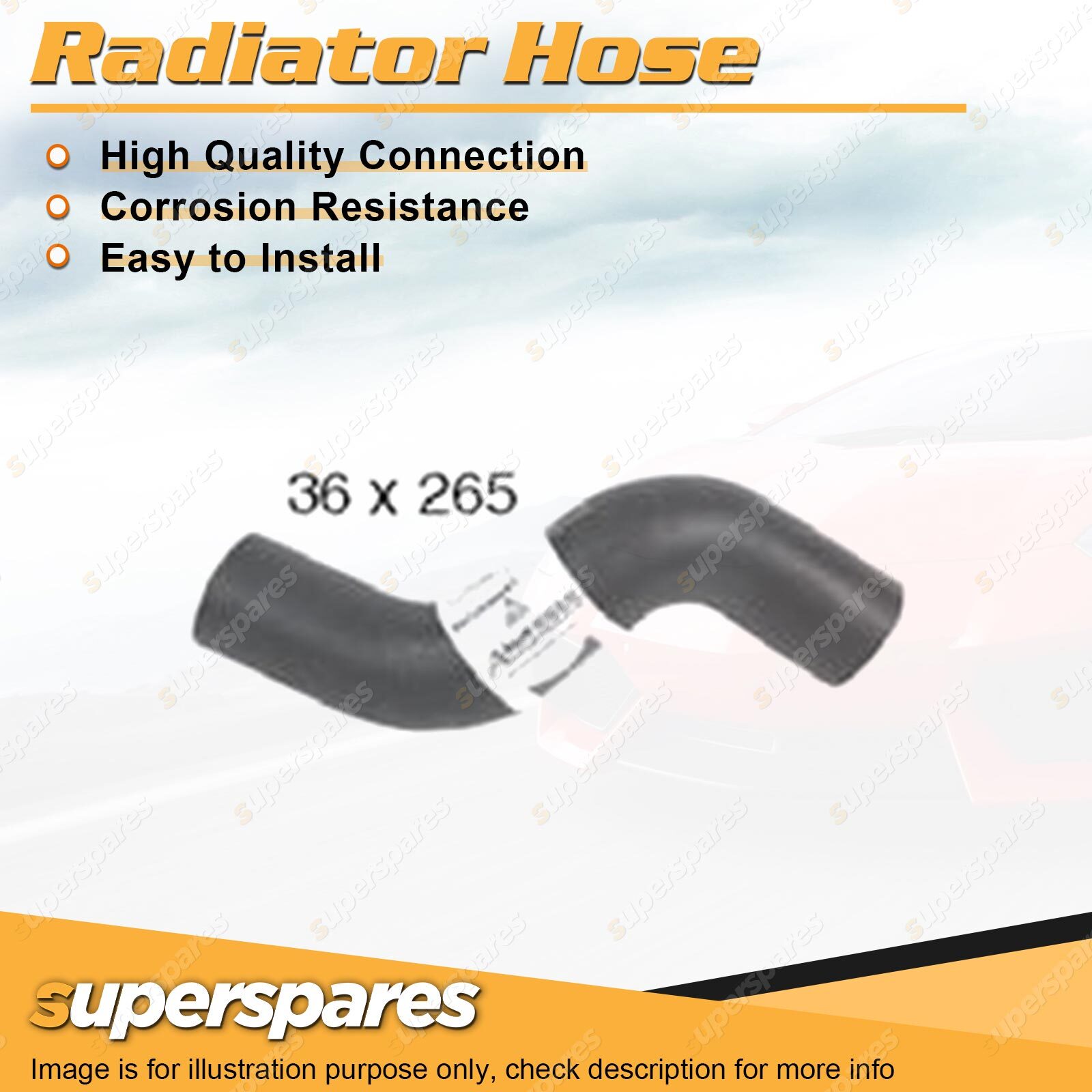 Content : 1 x Radiator Hose Brand : Superspares Position : Upper | Parameter : Length : 265mm Inside Diameter : 36mm |