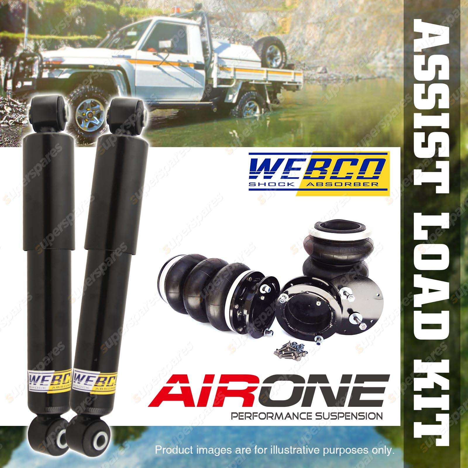 CONTENTS: 2 x Webco Elite Gas Shock Absorbers 1 x Full replacement Air Bag Load Assist Kit 2.27T SUIT: Landrover Discovery 4WD all models with & without active ride control 2/1999-10/2002 |