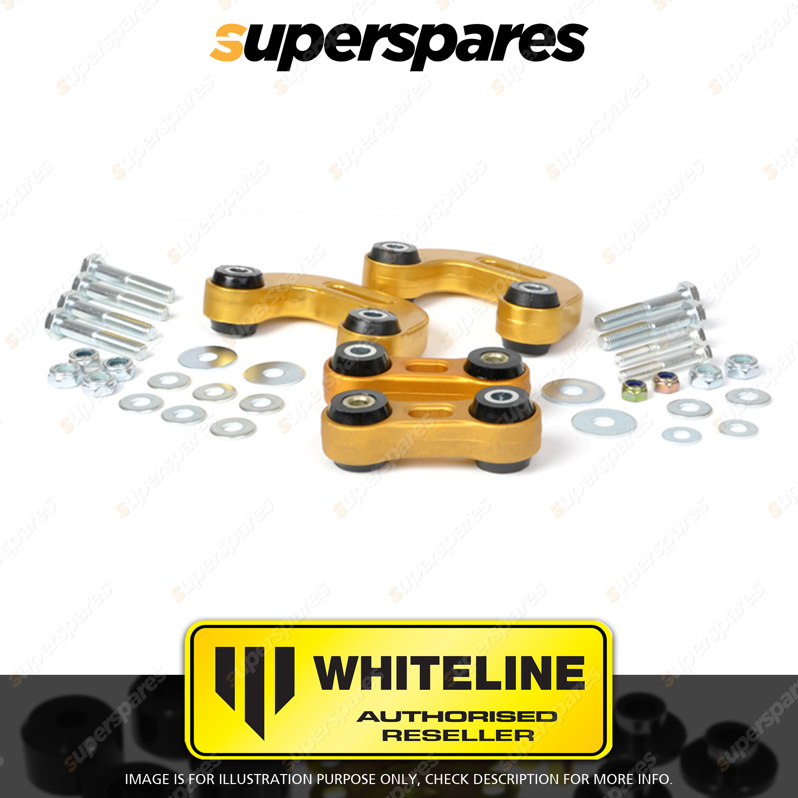 | Contents : Whiteline F and R Sway bar - link Warranty : 3 Year / 60,000Kms Kit Contents : 4 Links, 8 Bolts, 16 Washers, 8 Nuts, Install Guide, Grease | Kit Specifications : Link Type : Bushing |