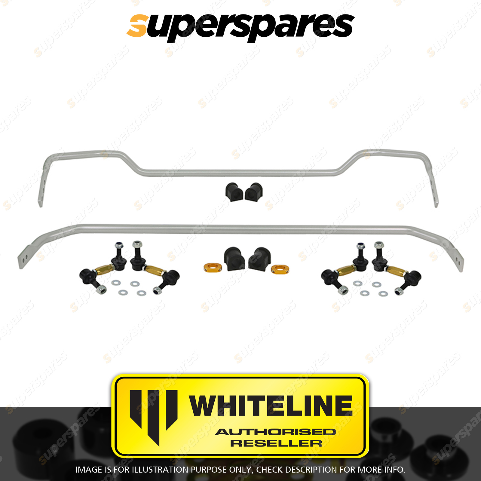 | Contents : Whiteline F and R Sway bar - vehicle kit Warranty : 3 Year / 60,000Kms Kit Contents : 2 Sway Bars, 4 Links, 4 Bushings, 2 Lateral Locks, 8 Washers, Install Guide, Grease |