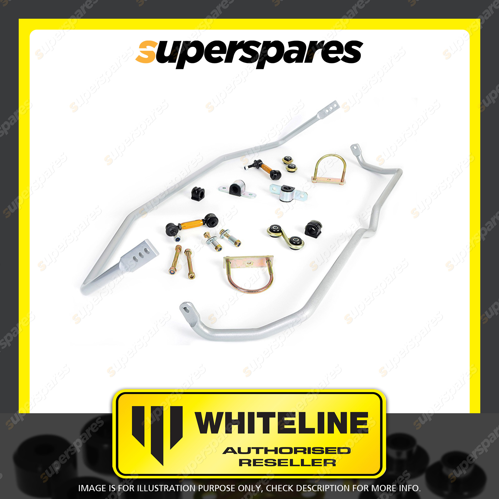 | Contents : Whiteline F and R Sway bar - vehicle kit Warranty : 3 Year / 60,000Kms Kit Contents : 2 Sway Bars, 4 Links, 4 Bushings, 2 Saddles, 2 Plates, 2 Spacers, 2 U-Bolts, 4 Bolts, 4 Washers, 4 Nuts, Install Guide, Grease |