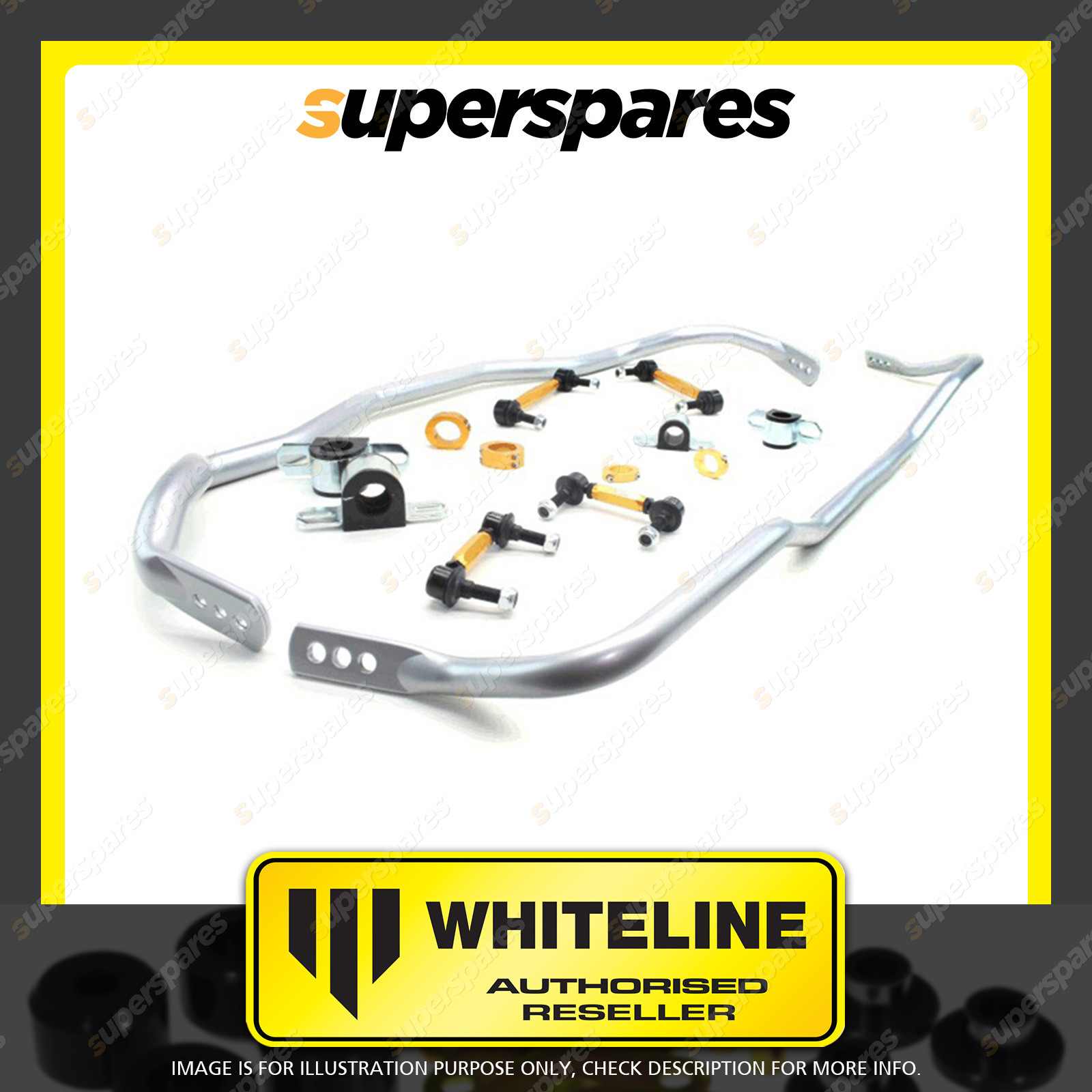 | Contents : Whiteline F and R Sway bar - vehicle kit Warranty : 3 Year / 60,000Kms Kit Contents : 2 Sway Bars, 4 Bushings, 2 Lateral Locks, Install Guide, Grease |