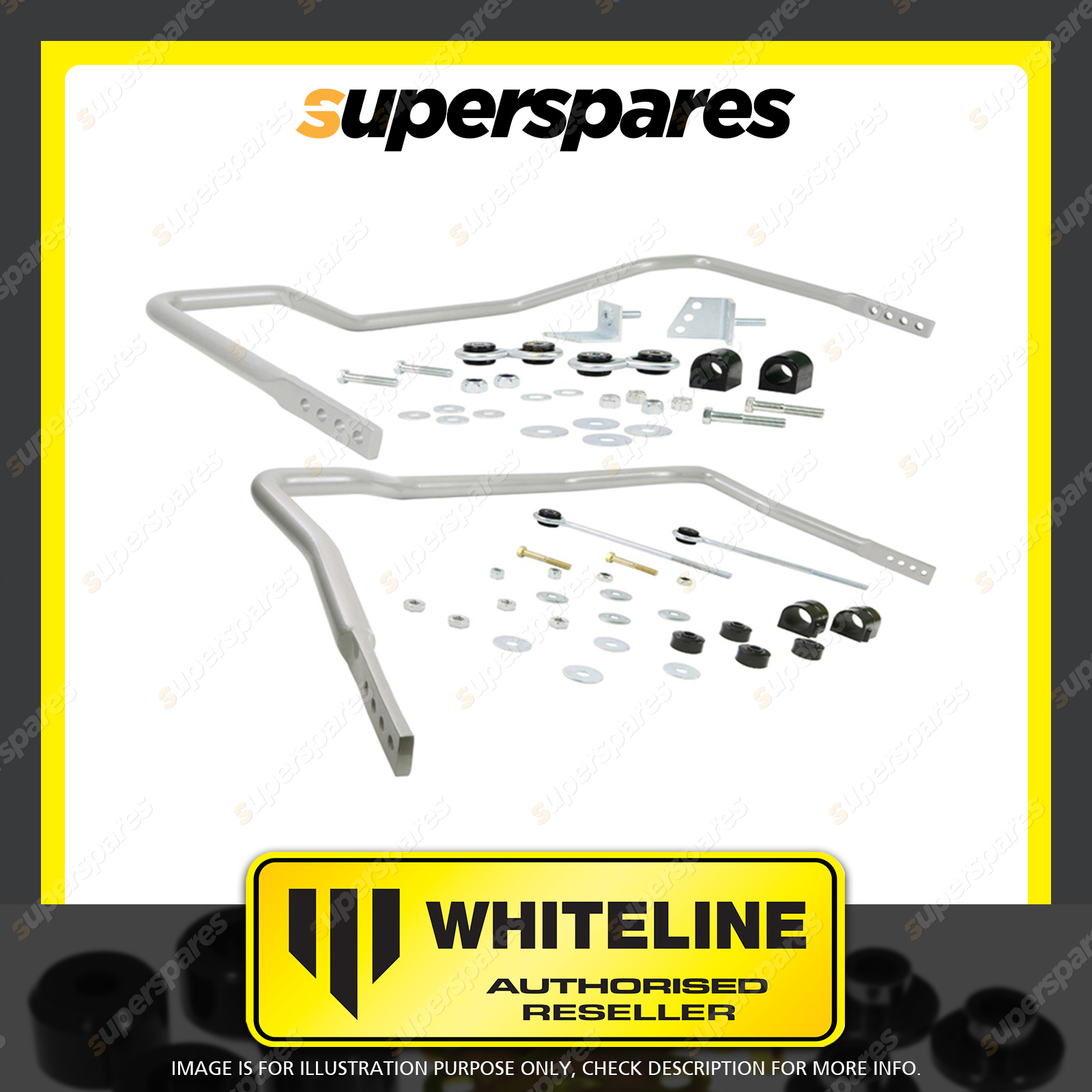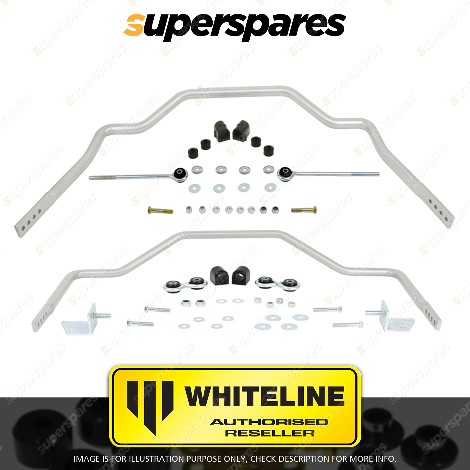 | Contents : Whiteline F and R Sway bar - vehicle kit Warranty : 3 Year / 60,000Kms Kit Contents : 2 Sway Bars, 4 Links, 8 Bushings, 2 Brackets, 6 Bolts, 18 Washers, 14 Nuts, Install Guide, Grease |