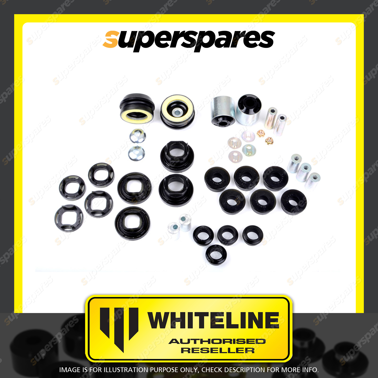 | Contents : Whiteline F and R Essential Vehicle Kit Warranty : 3 Year / 60,000Kms Kit Contents : 2 Strut Mounts, 2 Shell Bushings, 18 Bushings, 2 Bearings, 7 Tubes, 6 Washers, 2 Nuts, Install Guide, Grease |