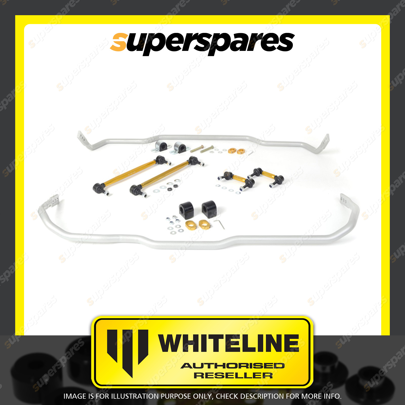 | Contents : Whiteline F and R Sway bar - vehicle kit Warranty : 3 Year / 60,000Kms Kit Contents : 2 Sway Bars, 4 Links, 4 Bushings, 2 Saddles, 4 Lateral Locks, 2 Spacers, 2 Bolts, 22 Washers, 4 Nuts, Install Guide |