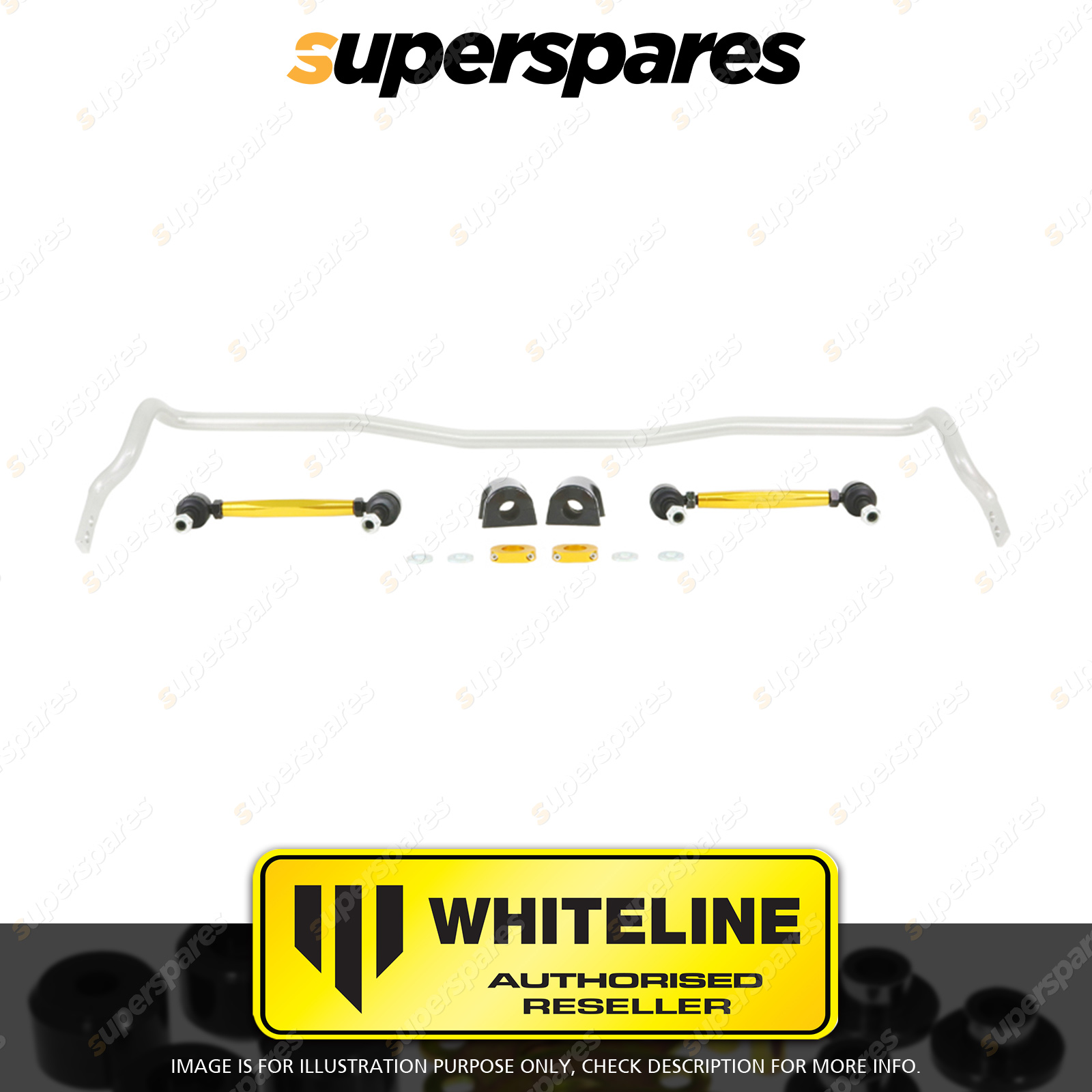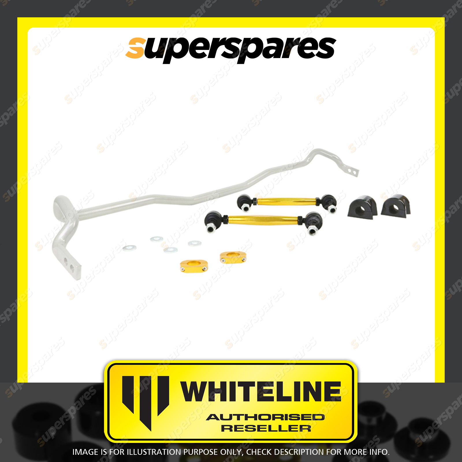 | Contents : Whiteline Front Sway bar Warranty : 3 Year / 60,000Kms Kit Contents : 1 Sway Bar, 2 Links, 2 Bushings, 2 Lateral Locks, 4 Washers, Install Guide | Kit Specifications : Diameter(mm) : 22mm |