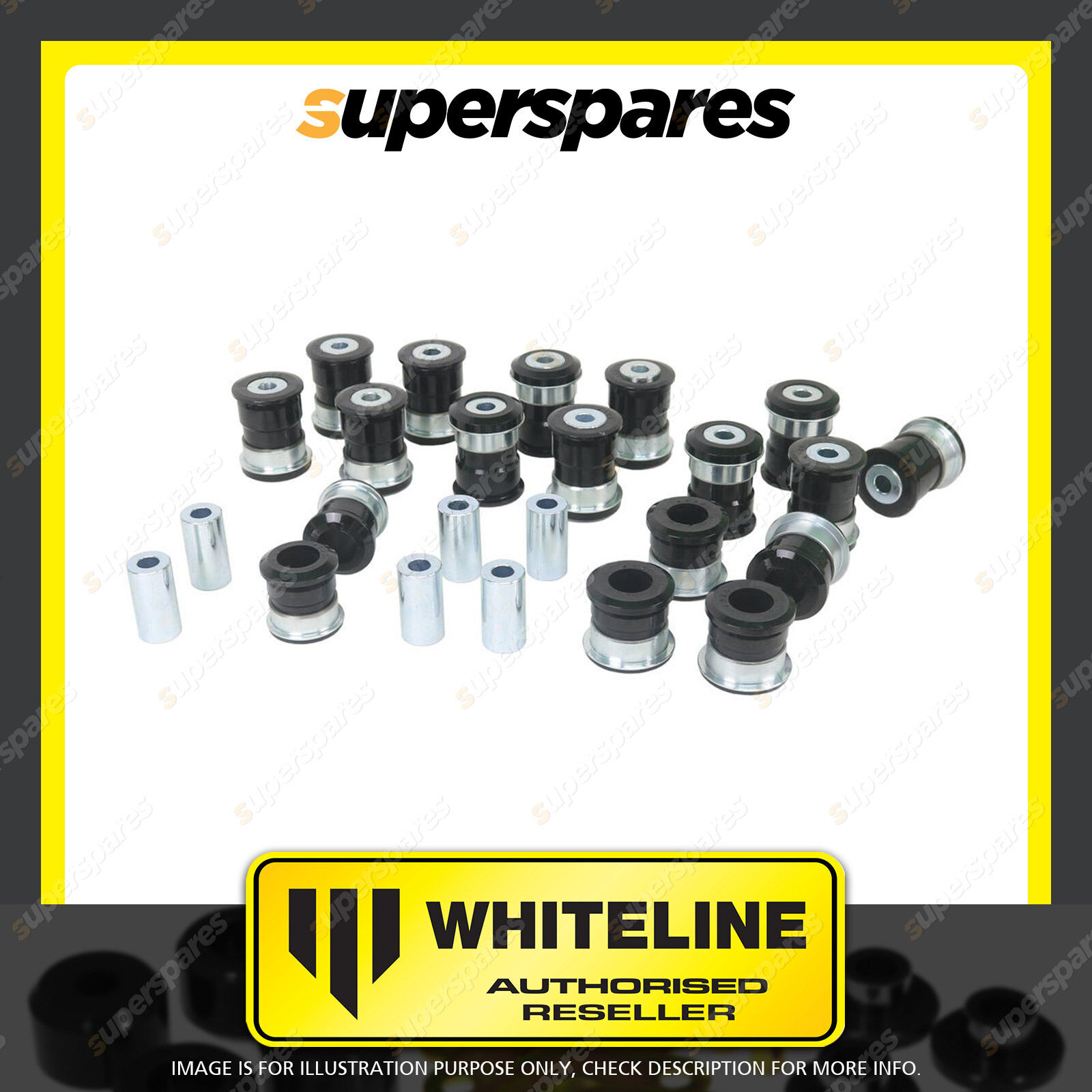 | Contents : Whiteline Front and Rear Essential Vehicle Kit Warranty : Lifetime Warranty Kit Contents : 18 Shell Bushings, 18 Tubes |