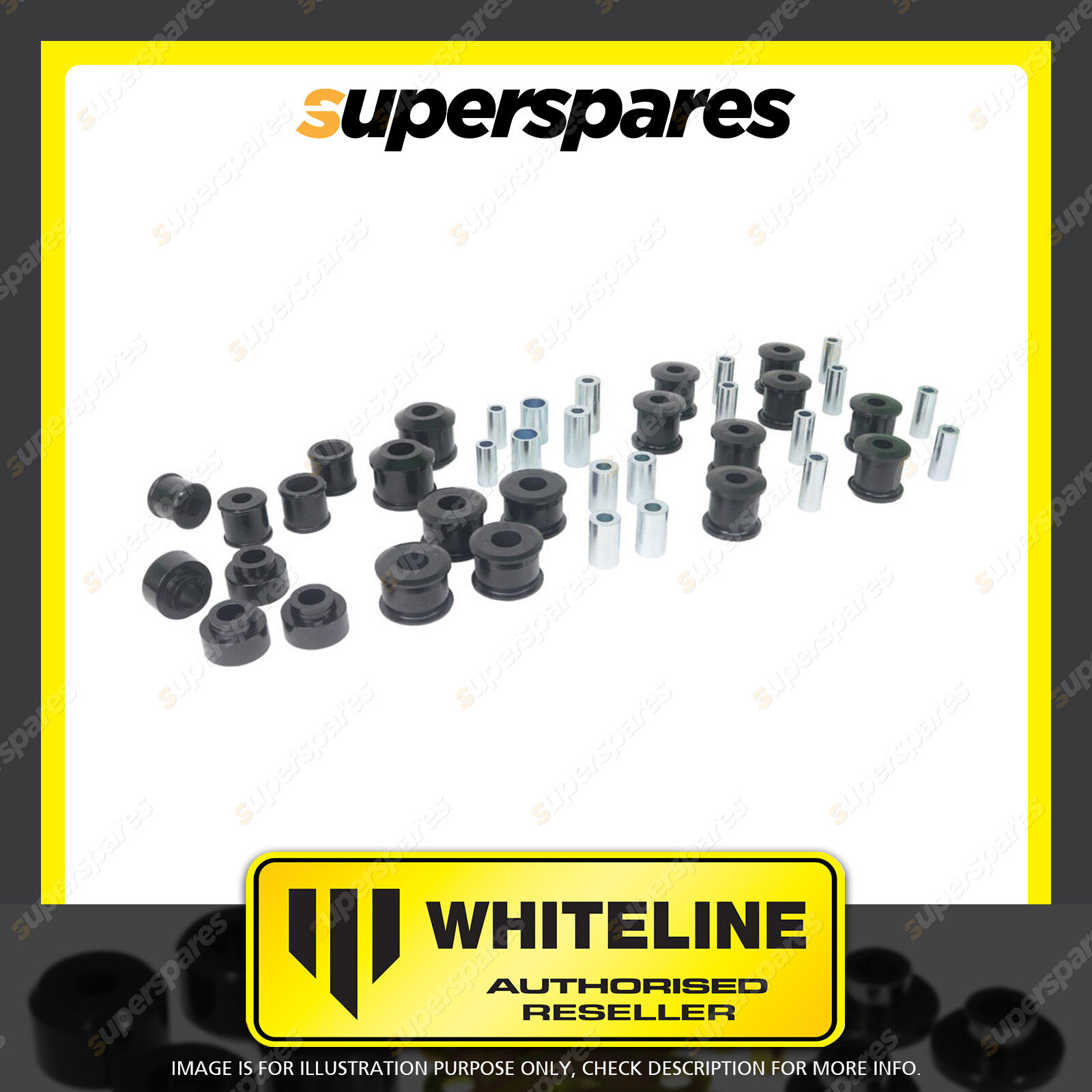| Contents : Whiteline Front and Rear Essential Vehicle Kit Warranty : Lifetime Warranty Kit Contents : 22 Bushings, 18 Tubes |