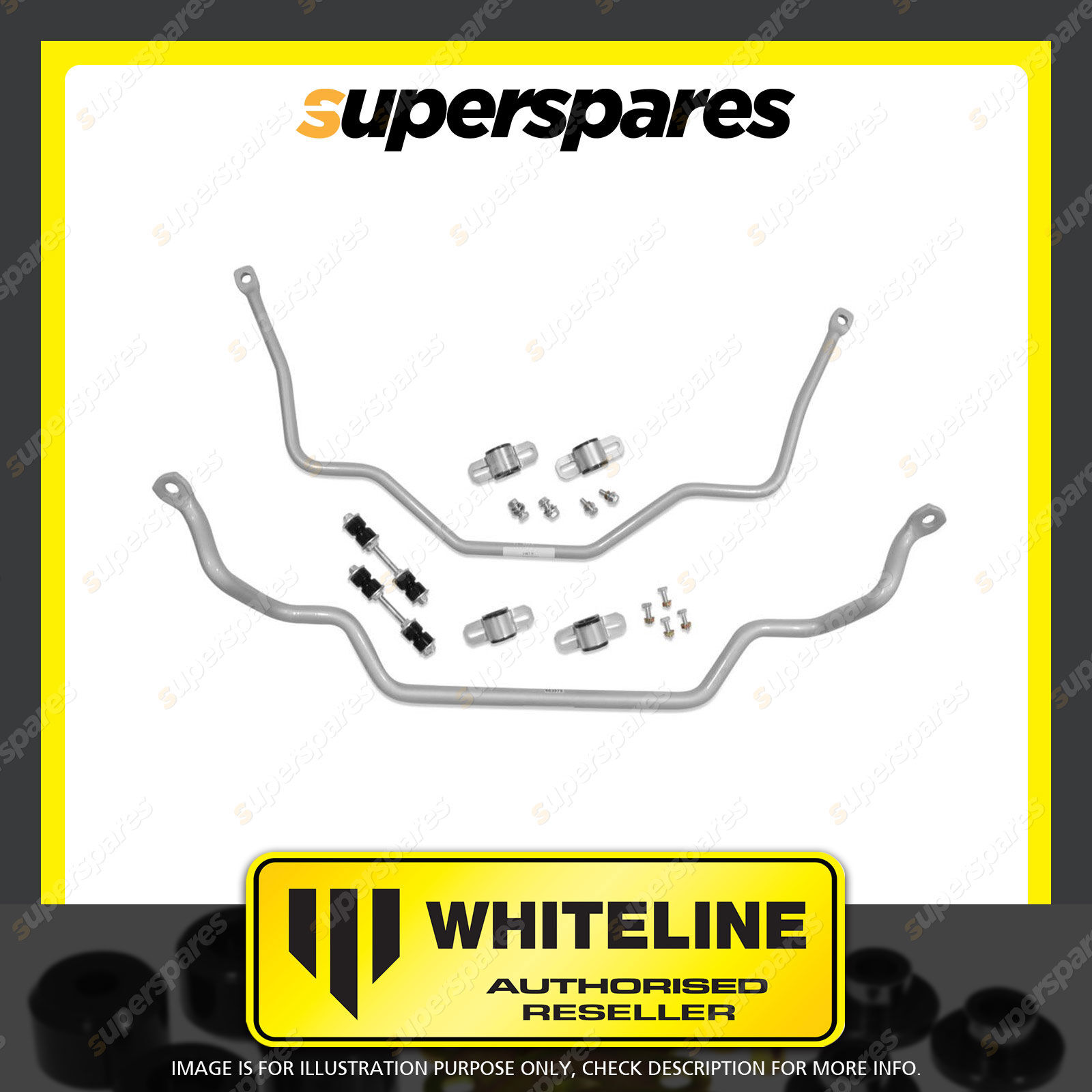 | Contents : Whiteline Front and Rear Sway Bar - Vehicle Kit Warranty : 3 Year / 60,000Kms Kit Contents : 2 Sway Bars, 4 Links, 4 Bushings,, Hardware |