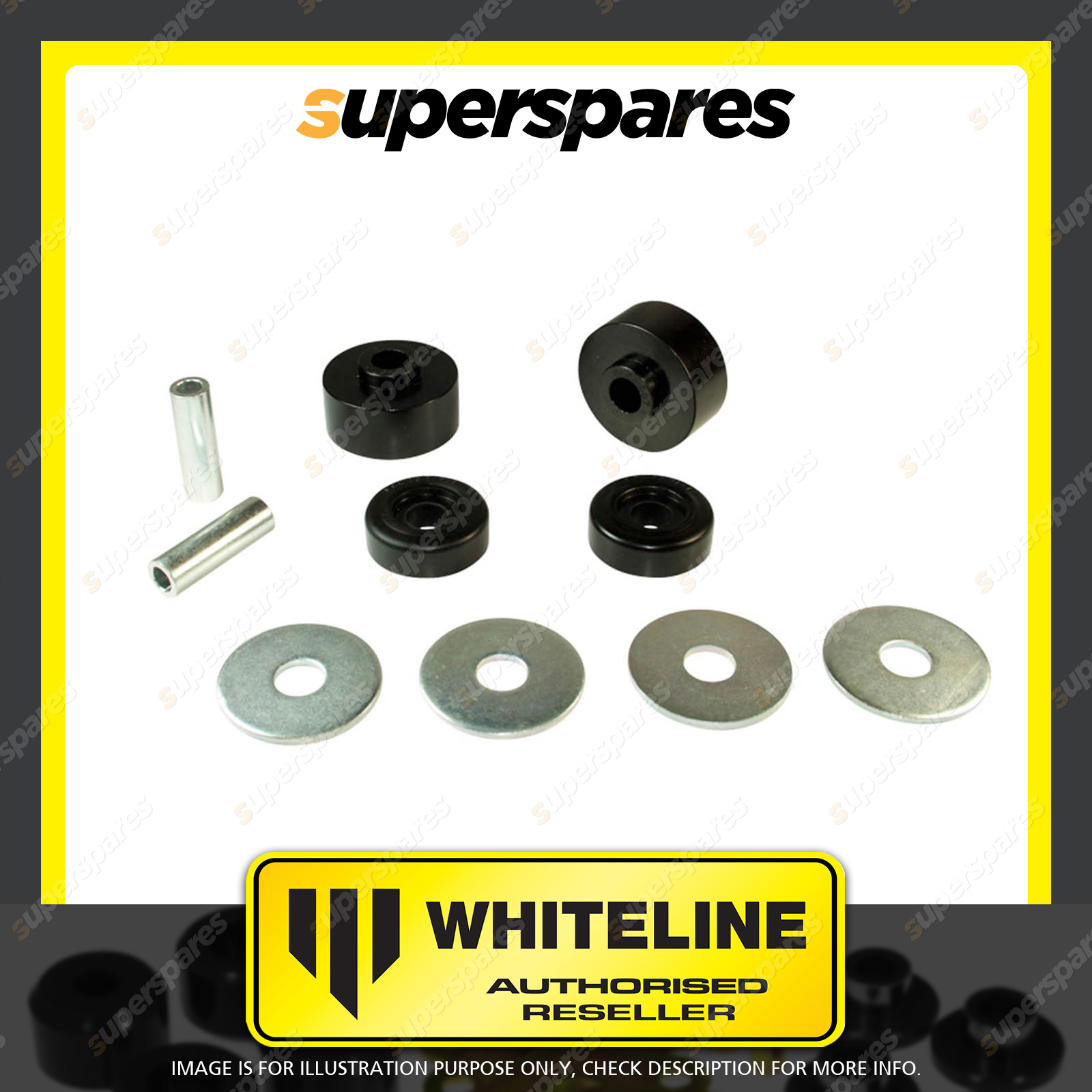 | Contents : Whiteline Front Body mount - bushing Warranty : 3 Year / 60,000Kms Kit Contents : 4 Bushings, 2 Tubes, 4 Washers |