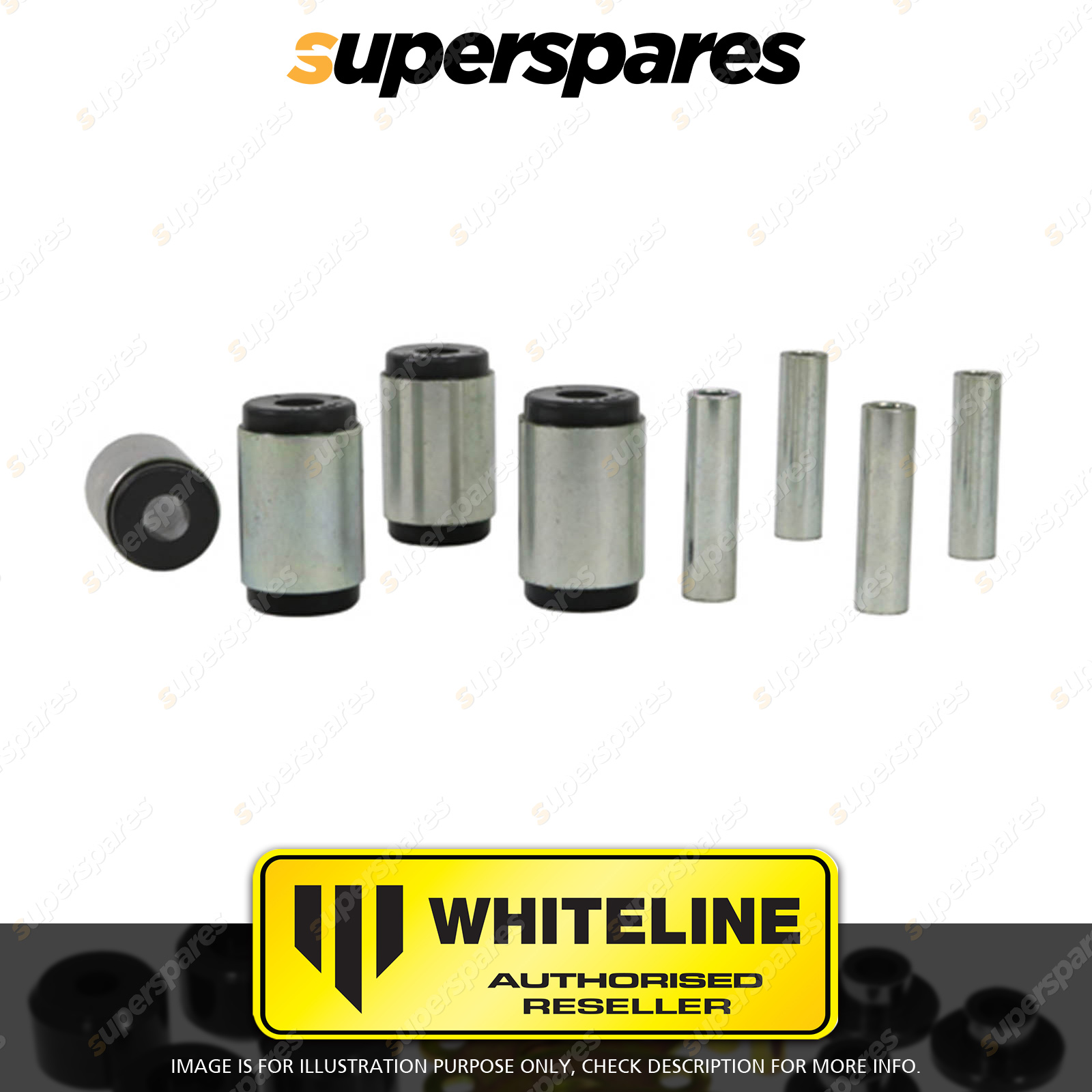 | Contents : Whiteline Front Control arm - lower inner bushing Warranty : 3 Year / 60,000Kms Kit Contents : 4 Shell Bushings, 4 Tubes, Grease |