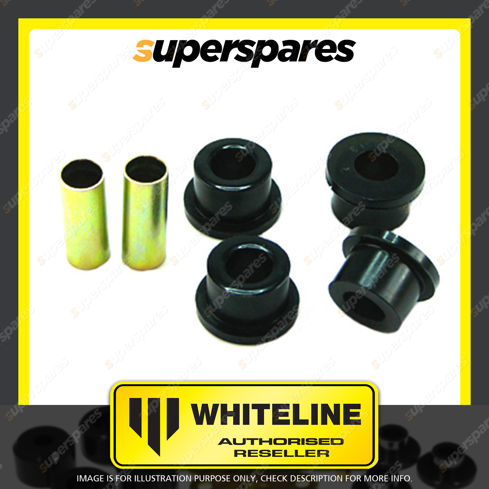 | Contents : Whiteline Front Control arm - lower inner Front bushing Warranty : 3 Year / 60,000Kms Kit Contents : 4 Bushings, 2 Tubes, Grease |
