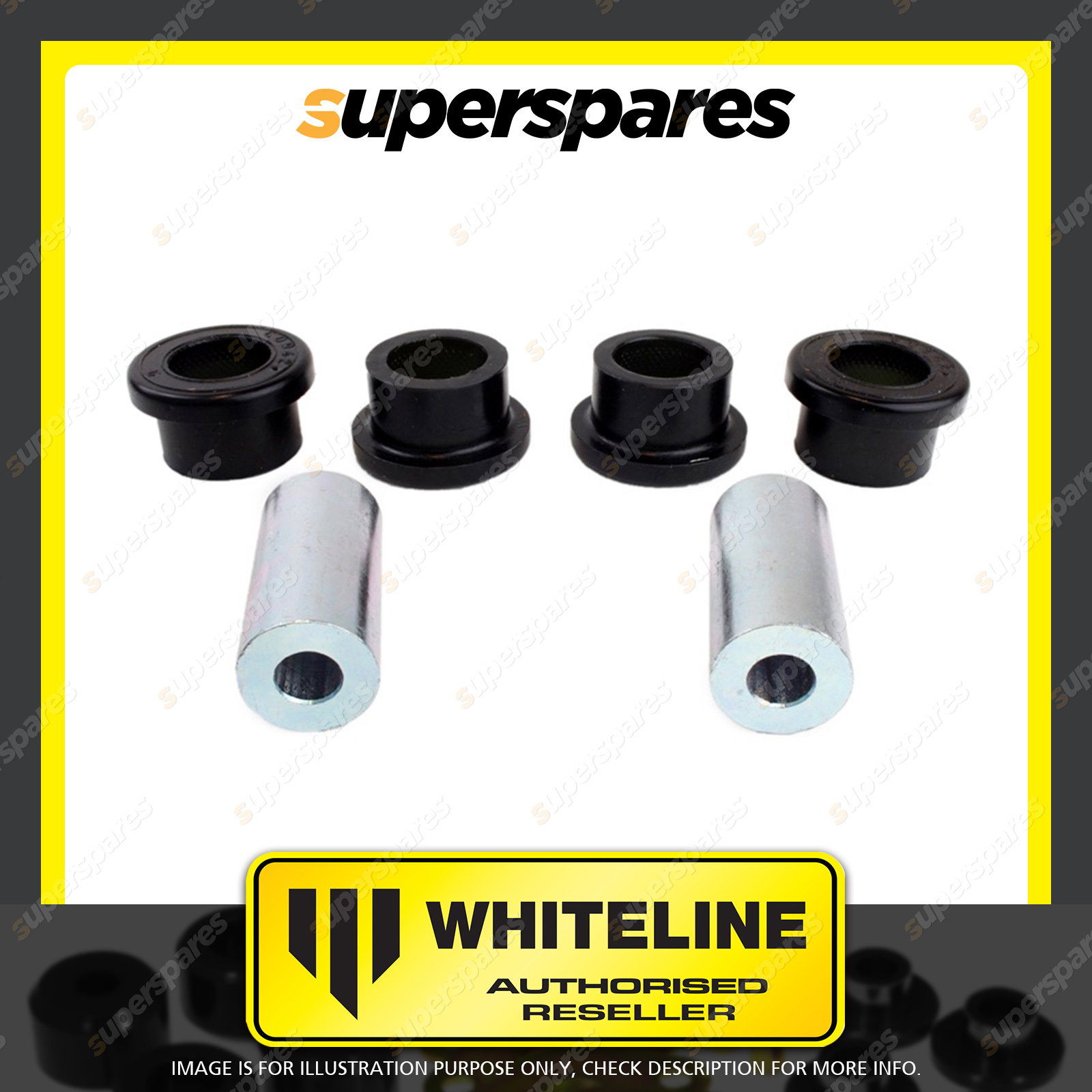 | Contents : Whiteline Front Control arm - lower inner Front bushing Warranty : 3 Year / 60,000Kms Kit Contents : 4 Bushings, 2 Tubes, Grease |