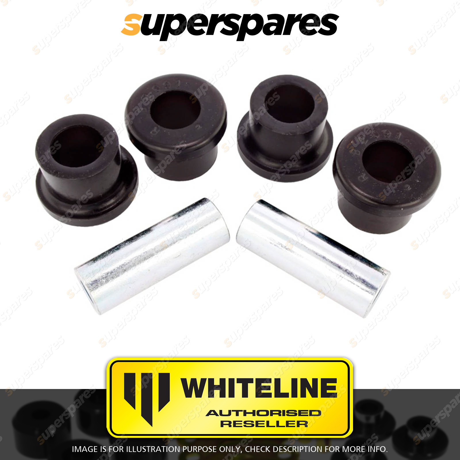 | Contents : Whiteline Front Control arm - lower inner Front bushing Warranty : 3 Year / 60,000Kms Kit Contents : 4 Bushings, 2 Tubes, Grease |
