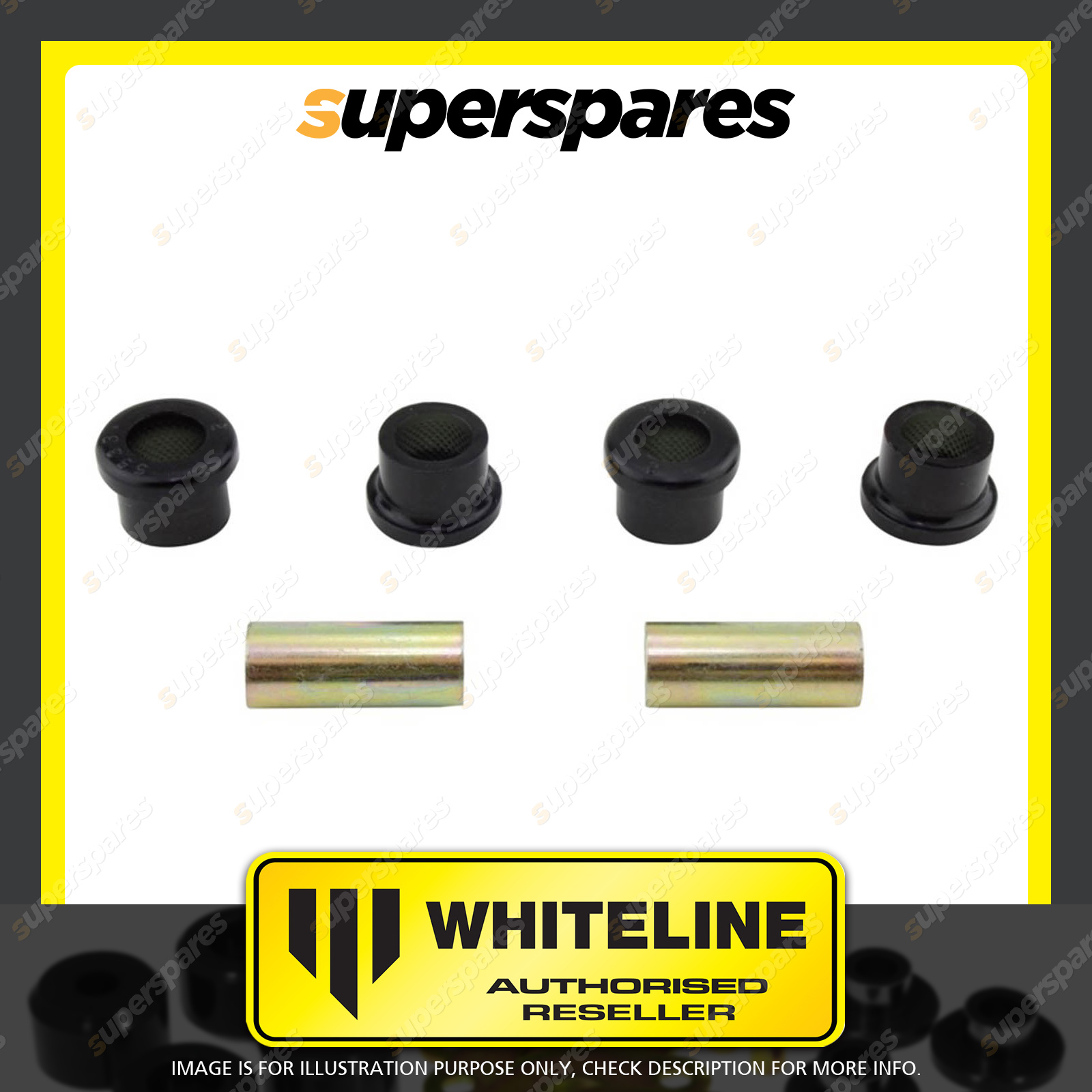 | Contents : Whiteline Front Control arm - lower inner Front bushing Warranty : 3 Year / 60,000Kms Kit Contents : 4 Bushings, 2 Tubes, Grease |