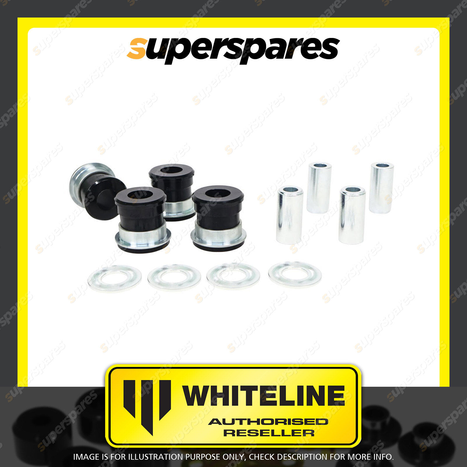 | Contents : Whiteline Front Control Arm Upper - Bushing Kit Warranty : Lifetime Warranty Kit Contents : 4 Shell Bushings, 4 Tubes, 4 Washers |