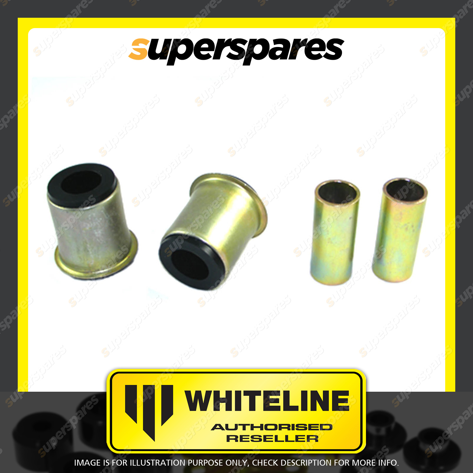 | Contents : Whiteline Front Control arm - upper inner Rear bushing Warranty : 3 Year / 60,000Kms Kit Contents : 2 Shell Bushings, 2 Tubes, Grease |