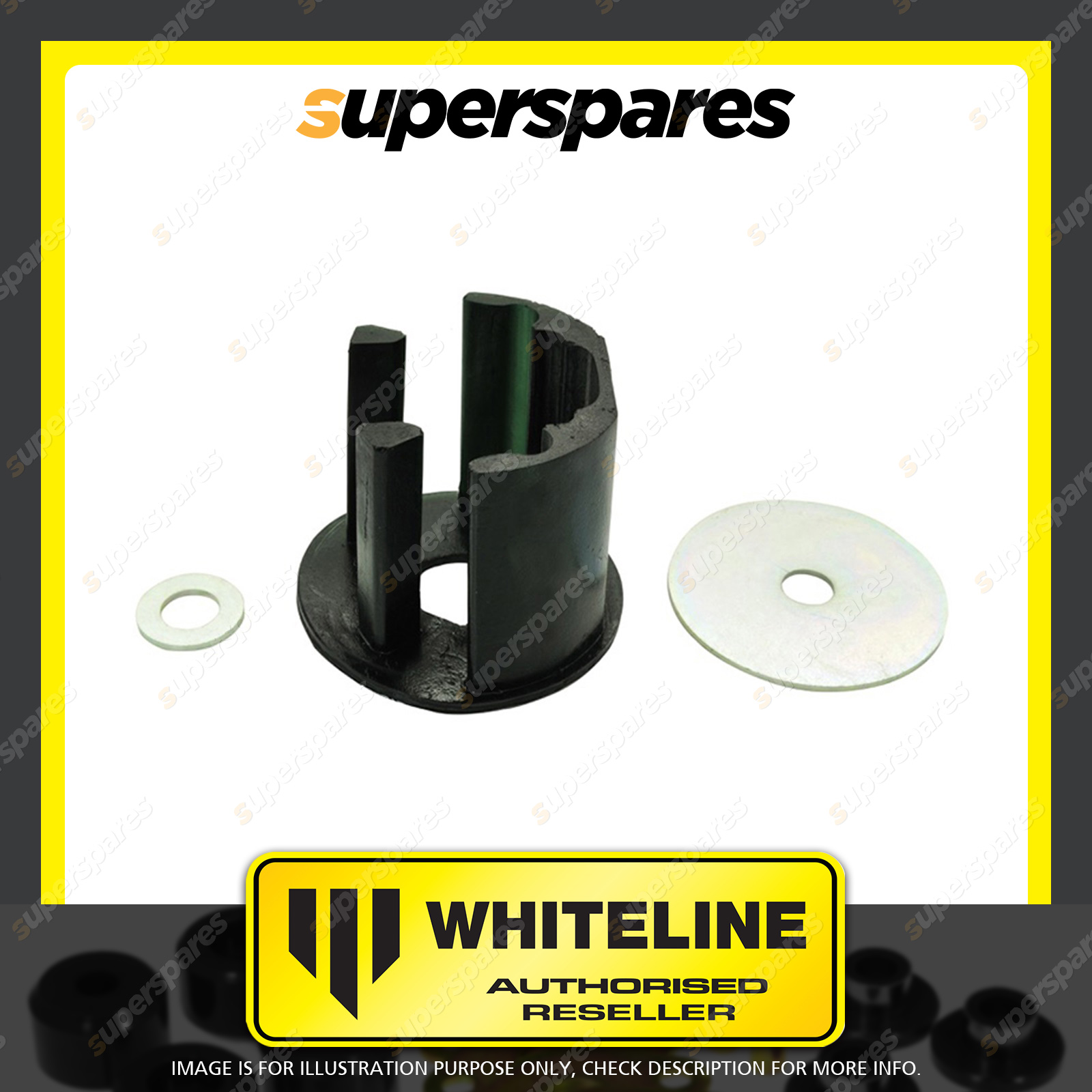 | Contents : Whiteline Front Engine - torque arm bushing Warranty : 3 Year / 60,000Kms Kit Contents : 1 Insert Bushing, 2 Washers, Install Guide, Grease |