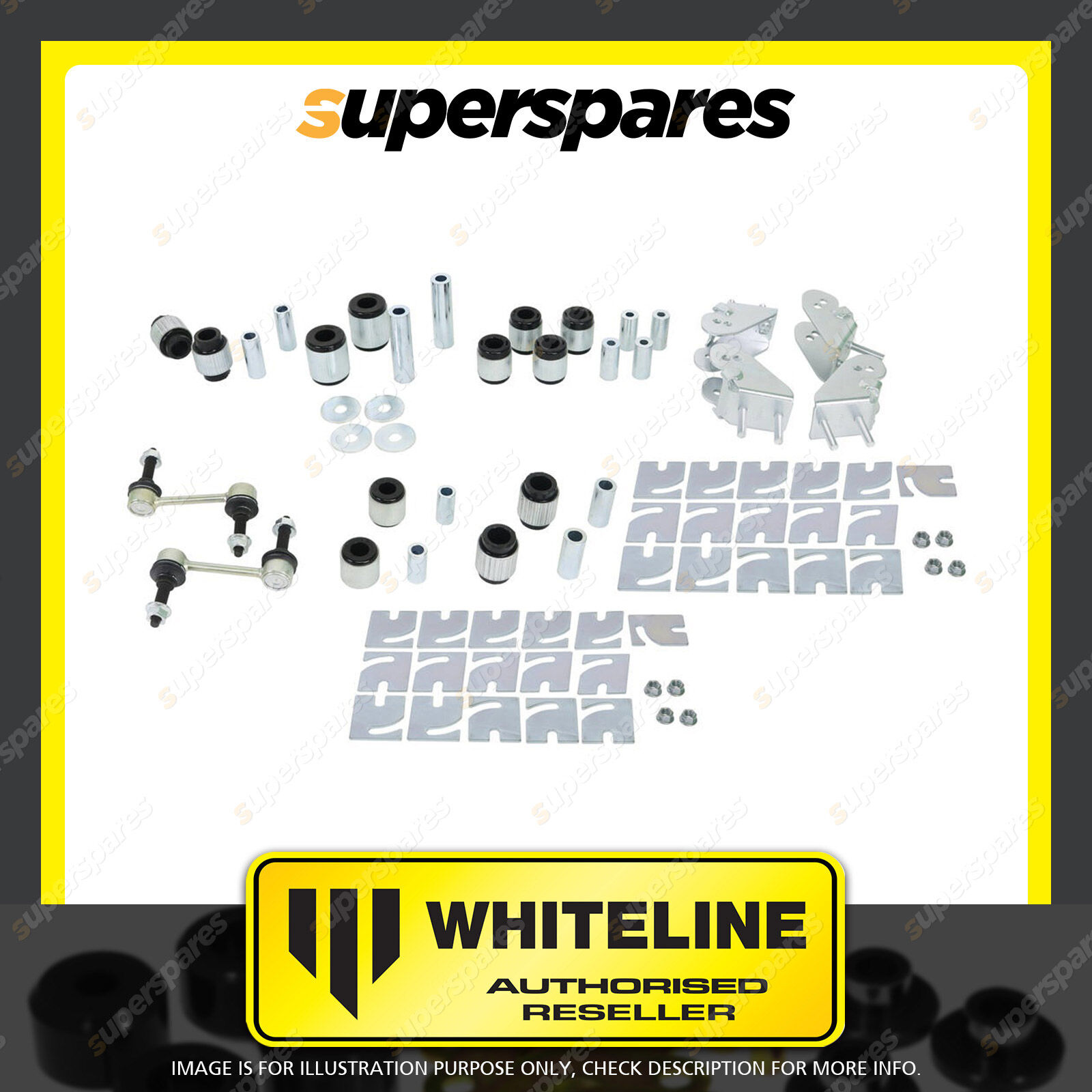 | Contents : Whiteline Front Essential Vehicle Bushing Kit Warranty : Lifetime Warranty Kit Contents : 6 Shell Bushings, 8 Bushings, 4 Housings, 2 Links, 10 Tubes, 32 Shims |