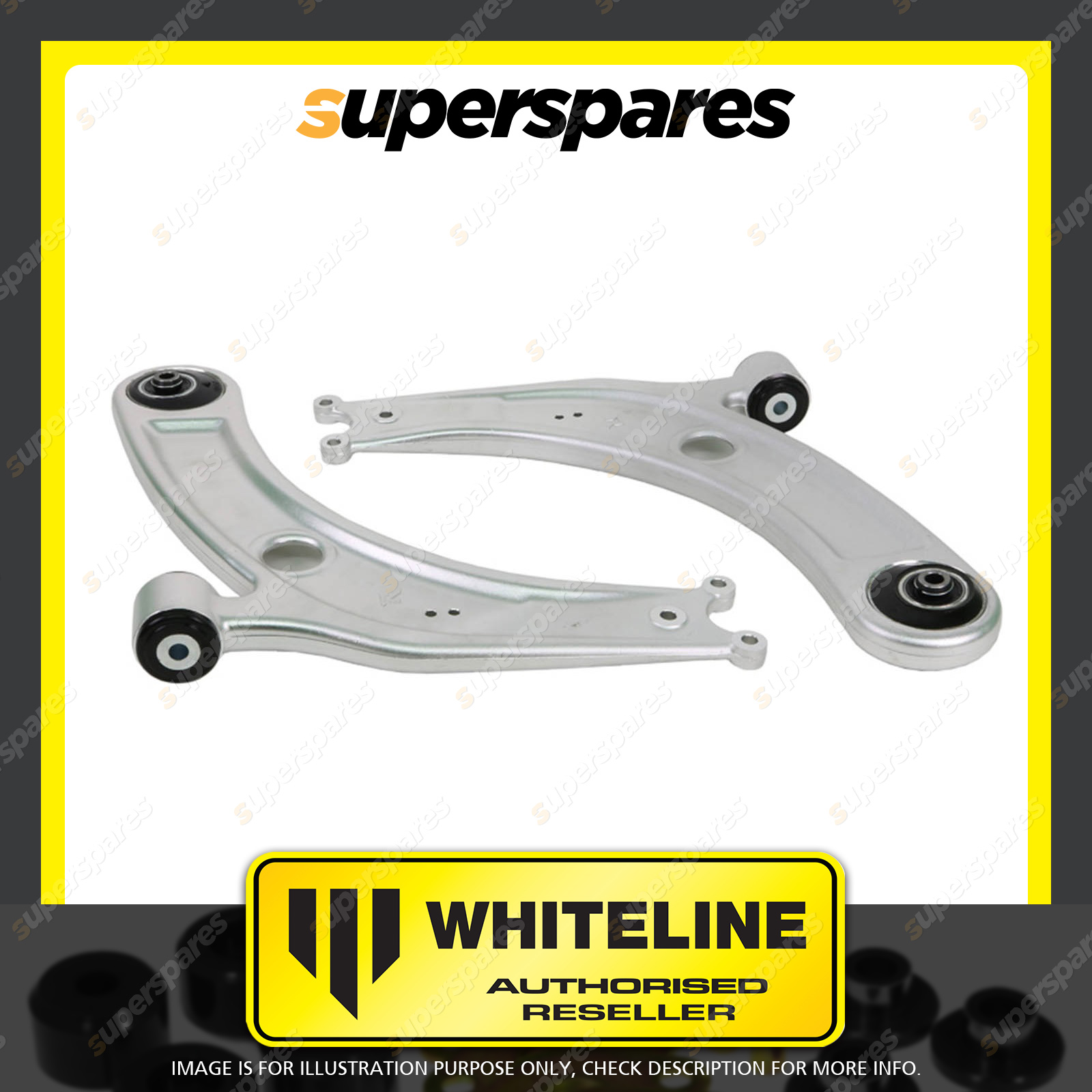 | Contents : Whiteline Front lower Control arm Warranty : 3 Year / 60,000Kms Kit Contents : 2 Arms, Install Guide, Grease |