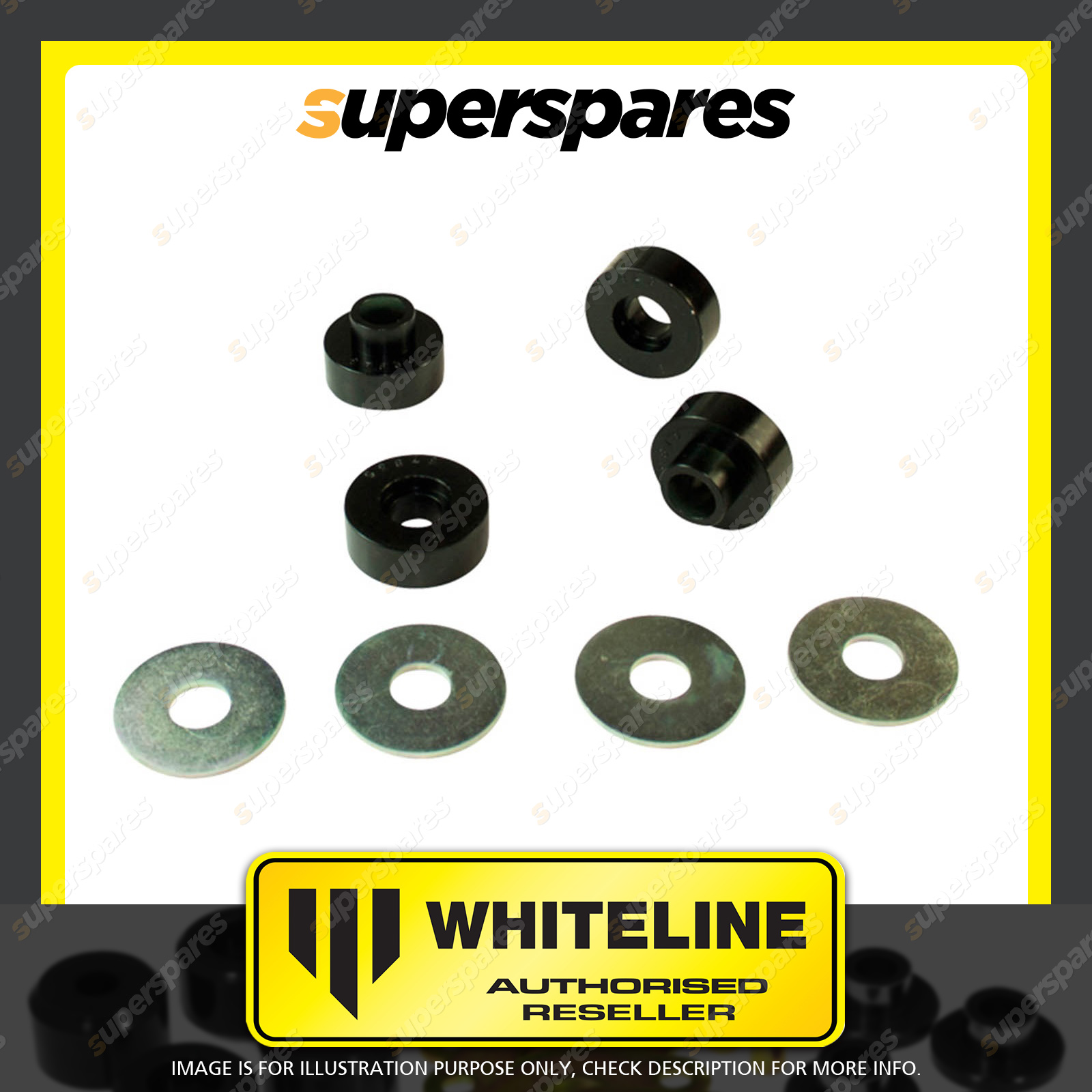 | Contents : Whiteline Front Shock absorber - upper bushing Warranty : 3 Year / 60,000Kms Kit Contents : 4 Bushings, 4 Washers, Install Guide, Grease |