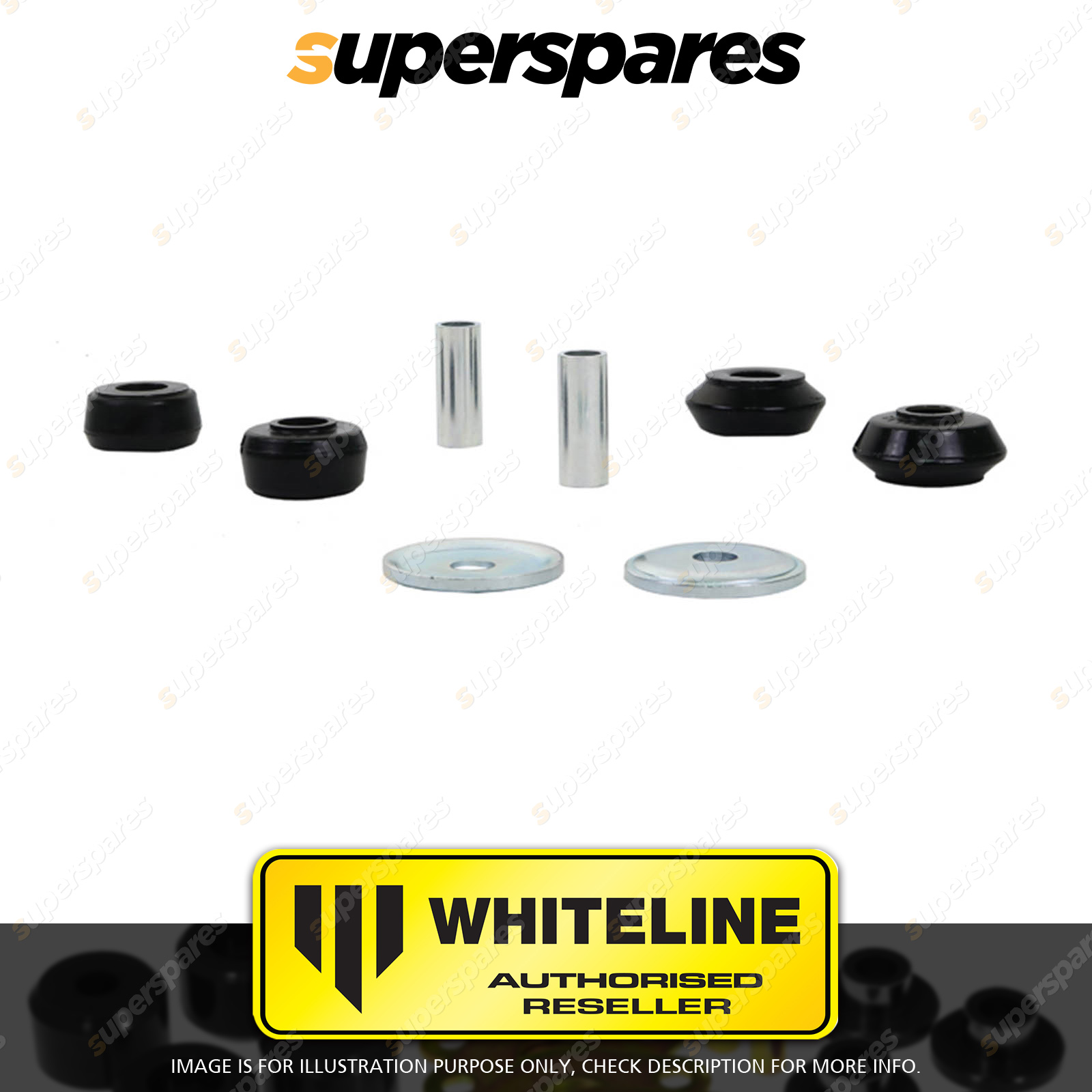 | Contents : Whiteline Front Shock absorber - upper bushing Warranty : 3 Year / 60,000Kms Kit Contents : 4 Bushings, 2 Tubes, 2 Washers, Install Guide, Grease |