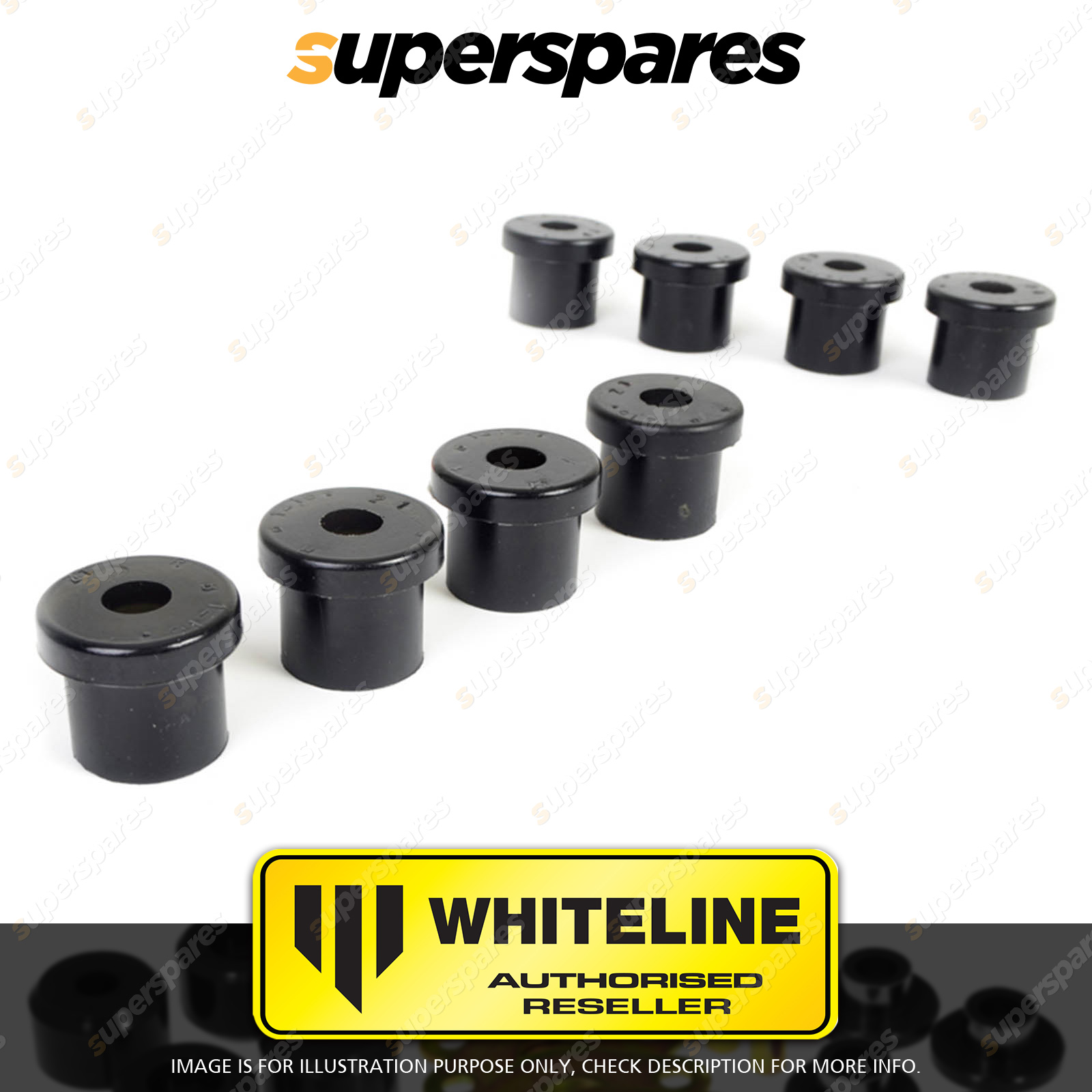 Contents : Whiteline Front Spring - eye rear and shackle bushing Warranty : 3 Year / 60,000Kms Kit Contents : 4 Bushings, 2 Tubes, Grease |