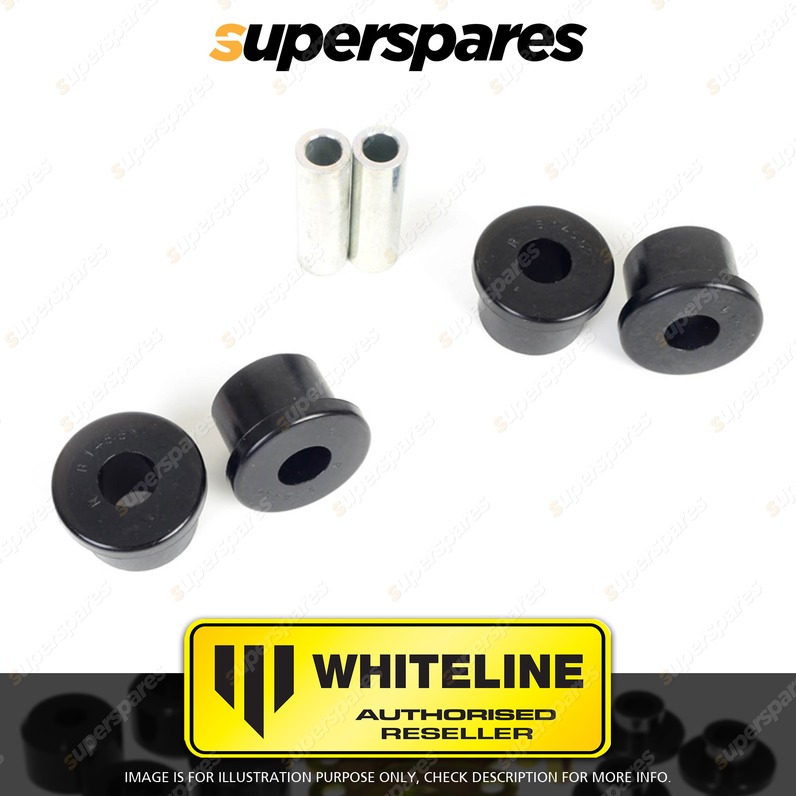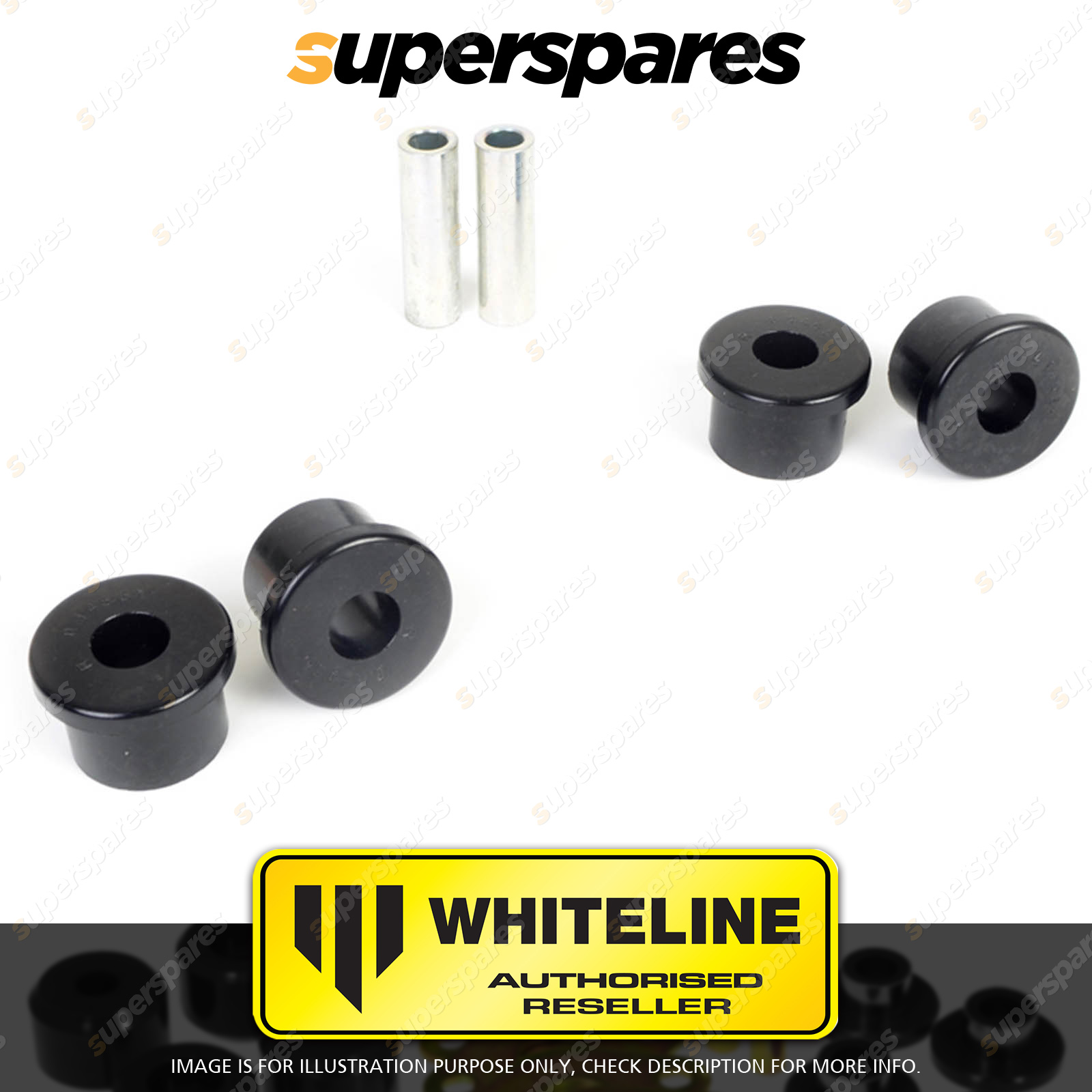 Contents : Whiteline Front Spring - eye front bushing Warranty : 3 Year / 60,000Kms Kit Contents : 4 Bushings, 2 Tubes, Grease |