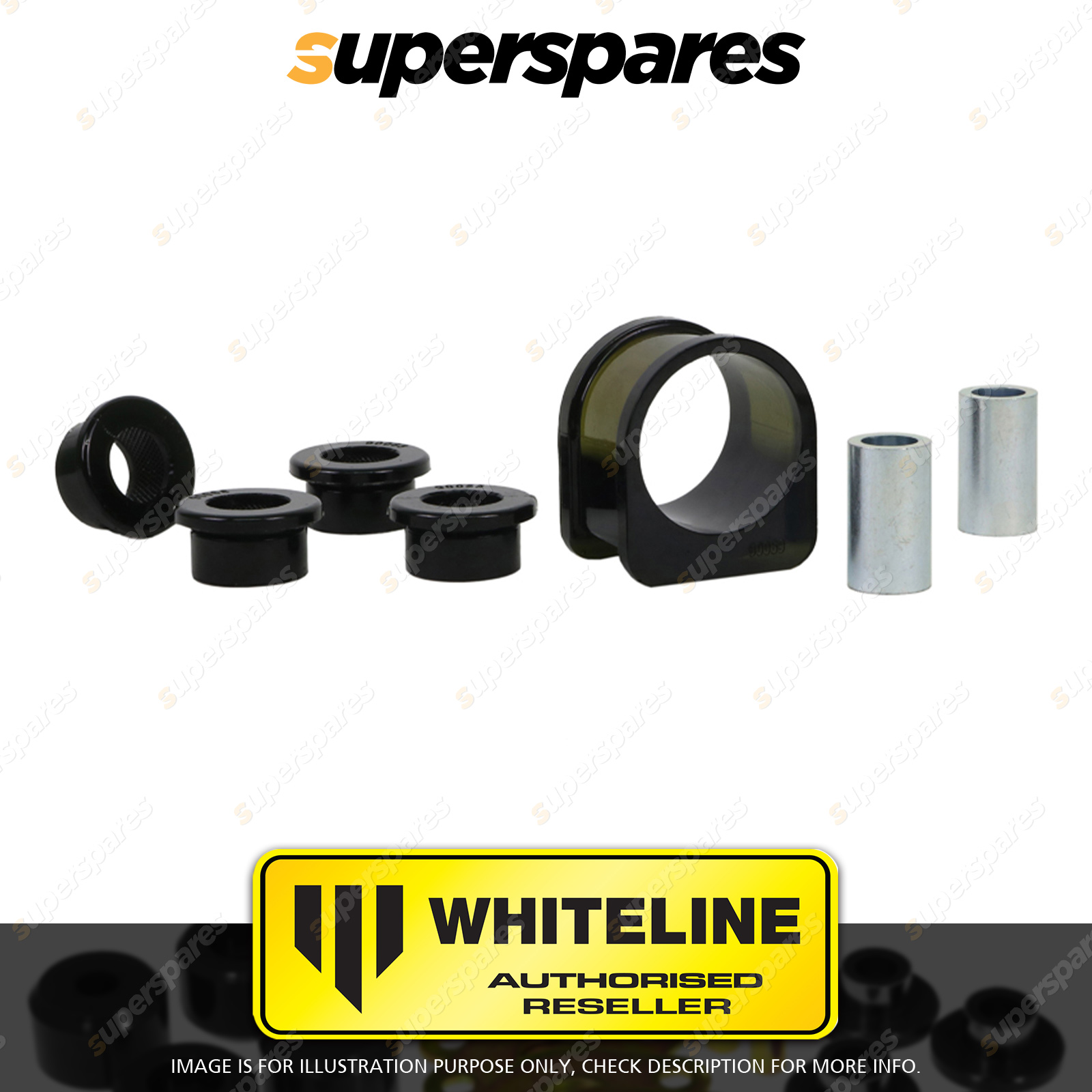 | Contents : Whiteline Front Steering - rack and pinion mount bushing Warranty : 3 Year / 60,000Kms Kit Contents : 5 Bushings, 2 Tubes, Grease | Kit Specifications : Bush Qty : 5 |