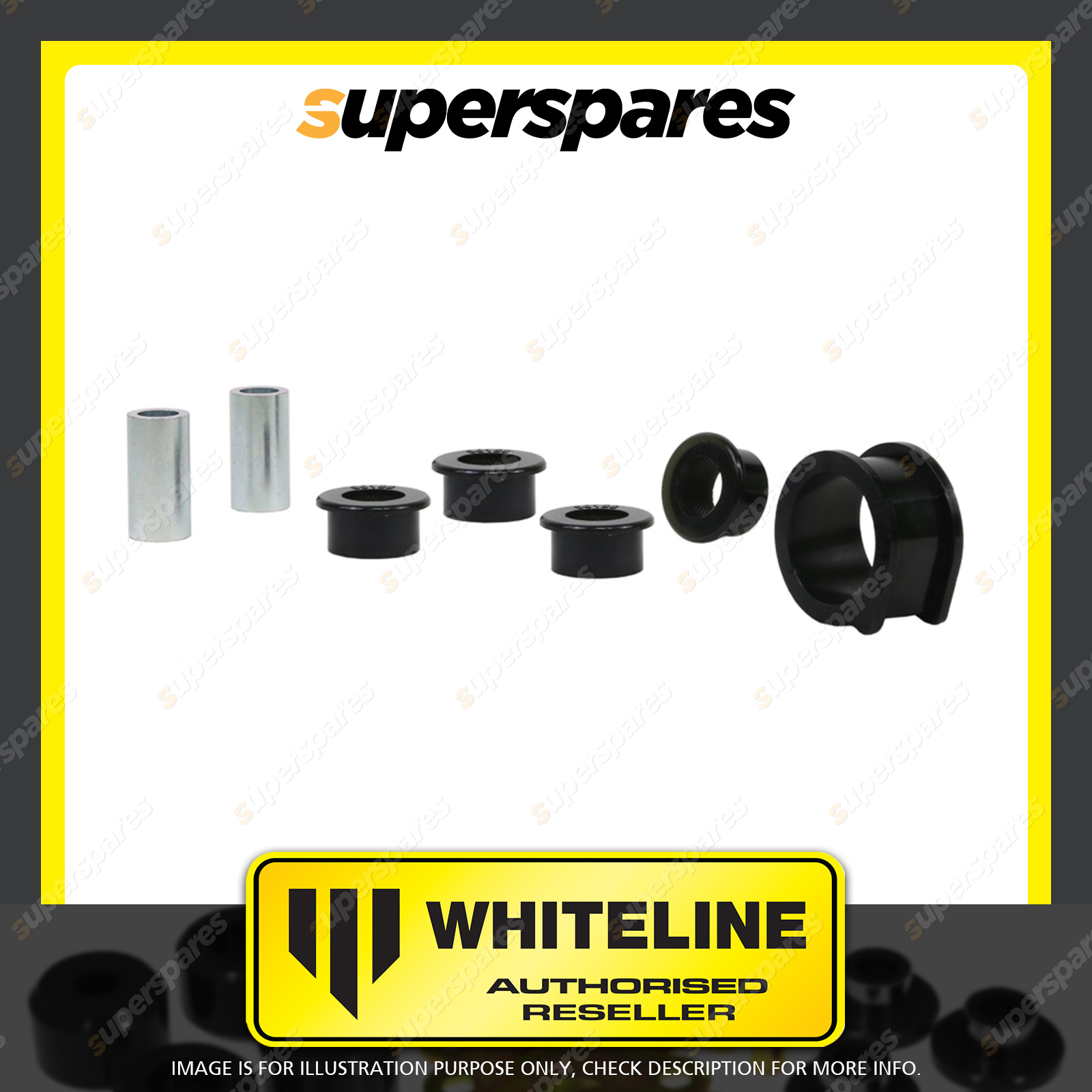 | Contents : Whiteline Front Steering - rack and pinion mount bushing Warranty : 3 Year / 60,000Kms Kit Contents : 5 Bushings, 2 Tubes, Install Guide, Grease | Kit Specifications : Bush Qty : 11 |