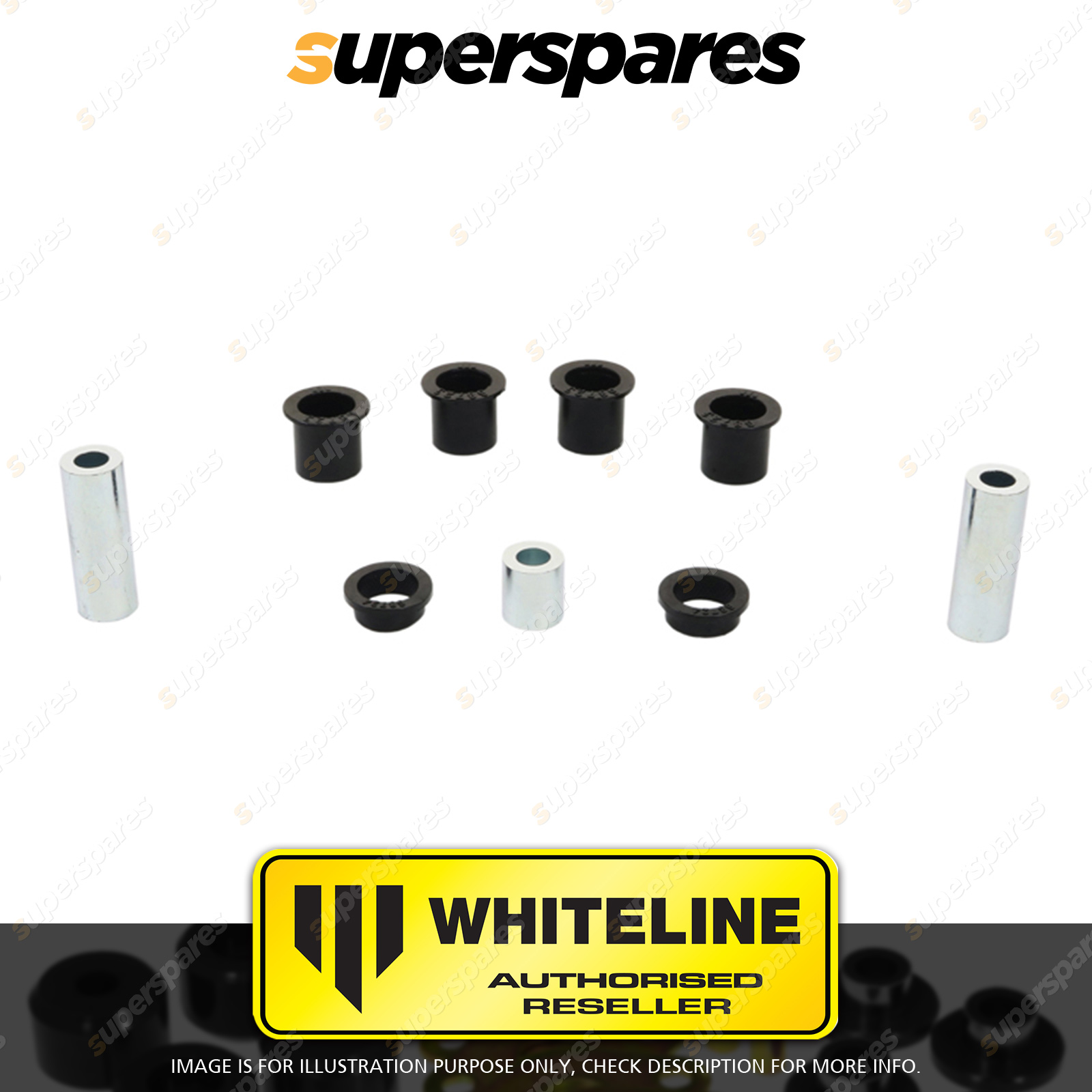 | Contents : Whiteline Front Steering - rack and pinion mount bushing Warranty : 3 Year / 60,000Kms Kit Contents : 6 Bushings, 3 Tubes, Install Guide, Grease |