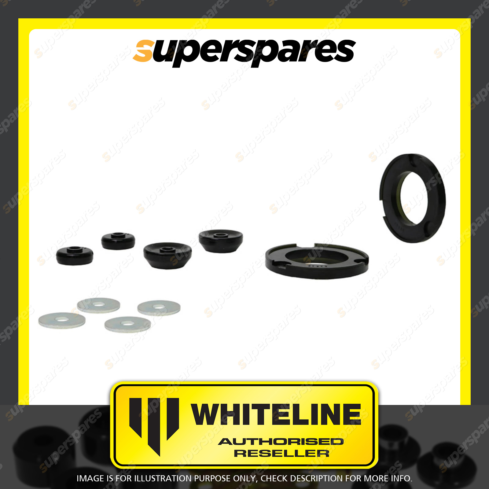 | Contents : Whiteline Front Strut mount - bushing Warranty : 3 Year / 60,000Kms Kit Contents : 6 Bushings, 4 Washers, Install Guide, Grease |