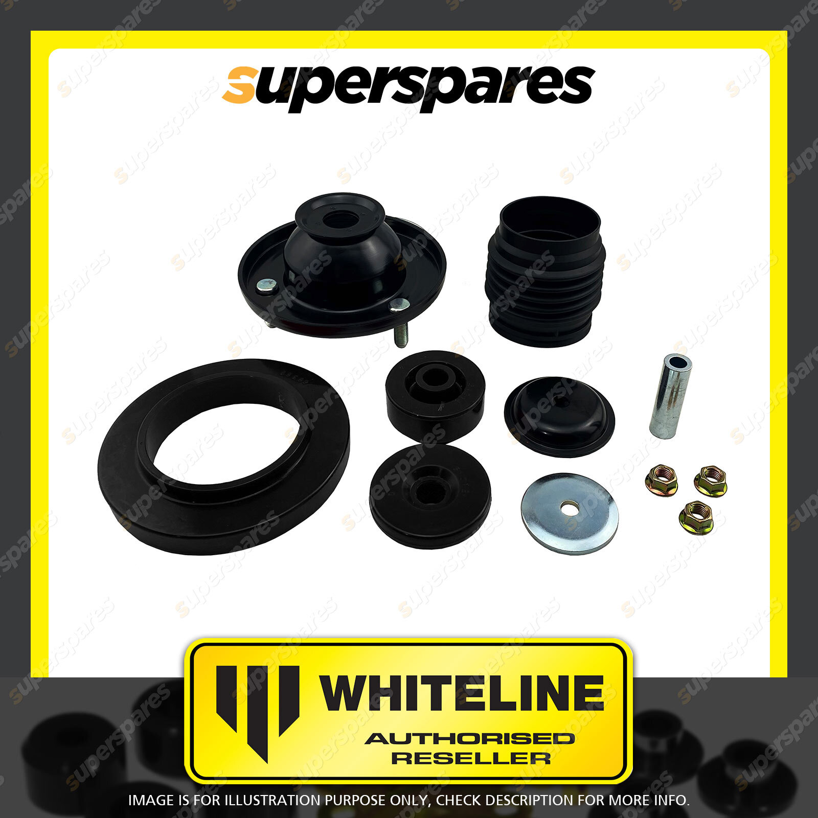 Contents : Whiteline Strut Mount - Bushing Position : Front Warranty : 3 Year / 60,000KMS Kit Contents : 1 Mount, 3 Bushings, 1 Boot, 1 Tube, 2 Washers, 3 Nuts |