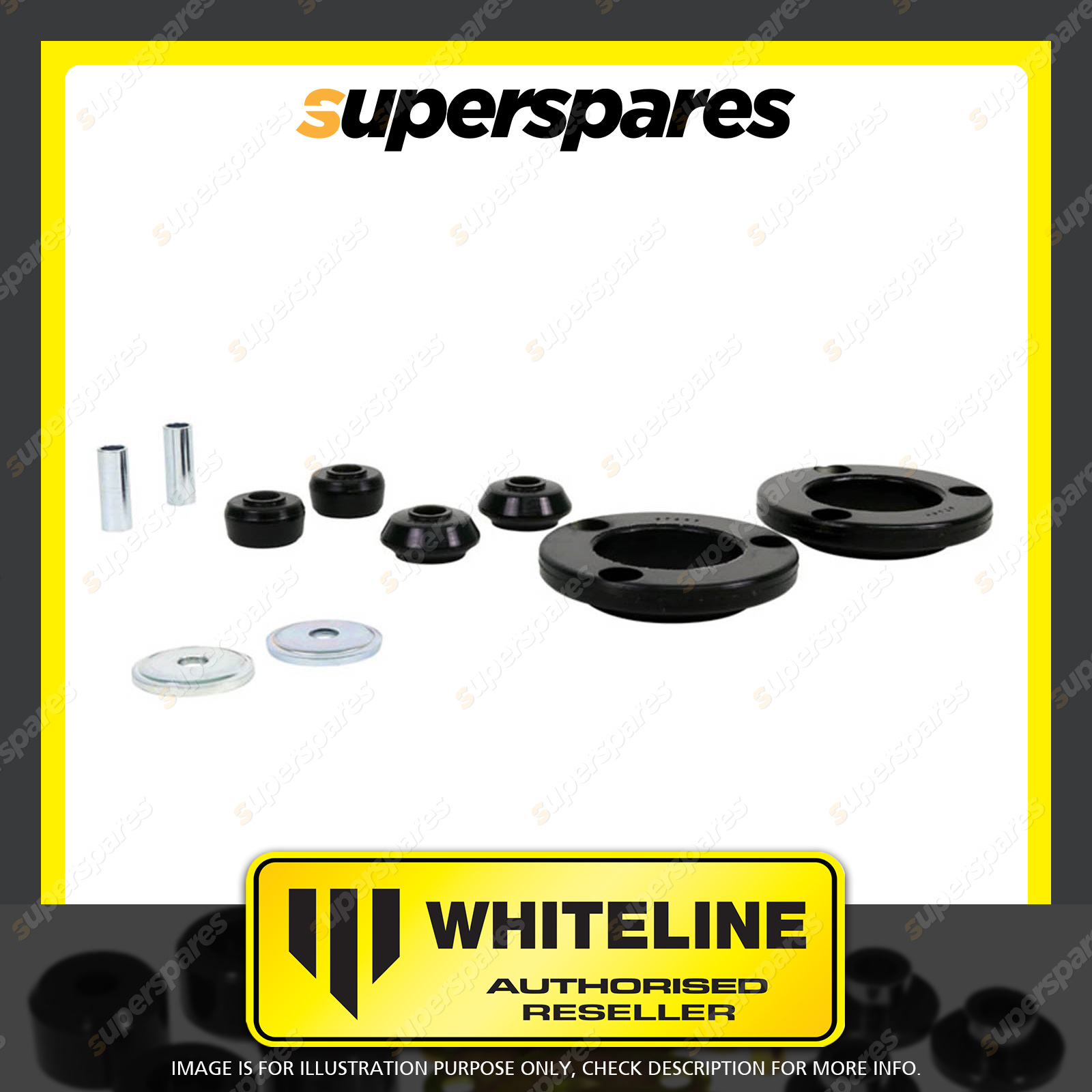 | Contents : Whiteline Front Strut mount - bushing Warranty : 3 Year / 60,000Kms Kit Contents : 6 Bushings, 2 Tubes, 2 Washers, Install Guide, Grease |