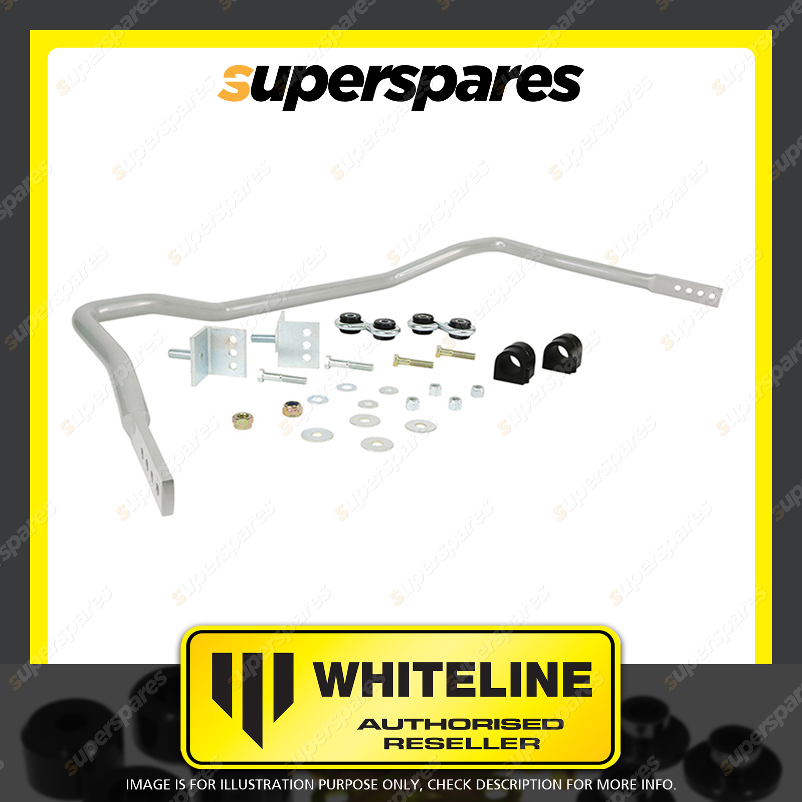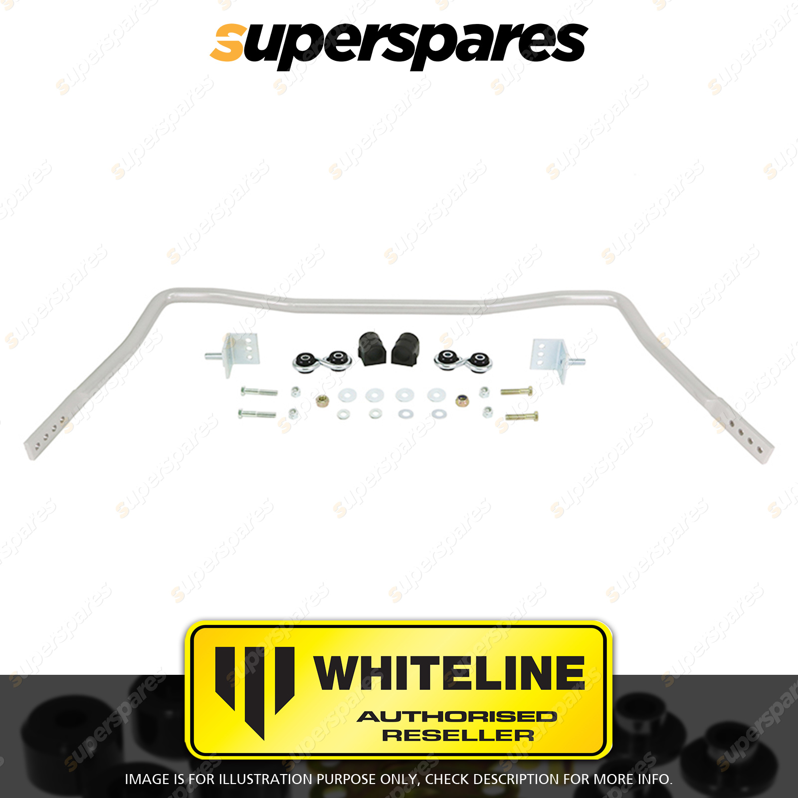 | Contents : Whiteline Front Sway bar Warranty : 3 Year / 60,000Kms Kit Contents : 1 Sway Bar, 2 Links, 2 Bushings, 2 Brackets, 4 Bolts, 8 Washers, 6 Nuts, Install Guide, Grease | Kit Specifications : Diameter(mm) : 27mm |