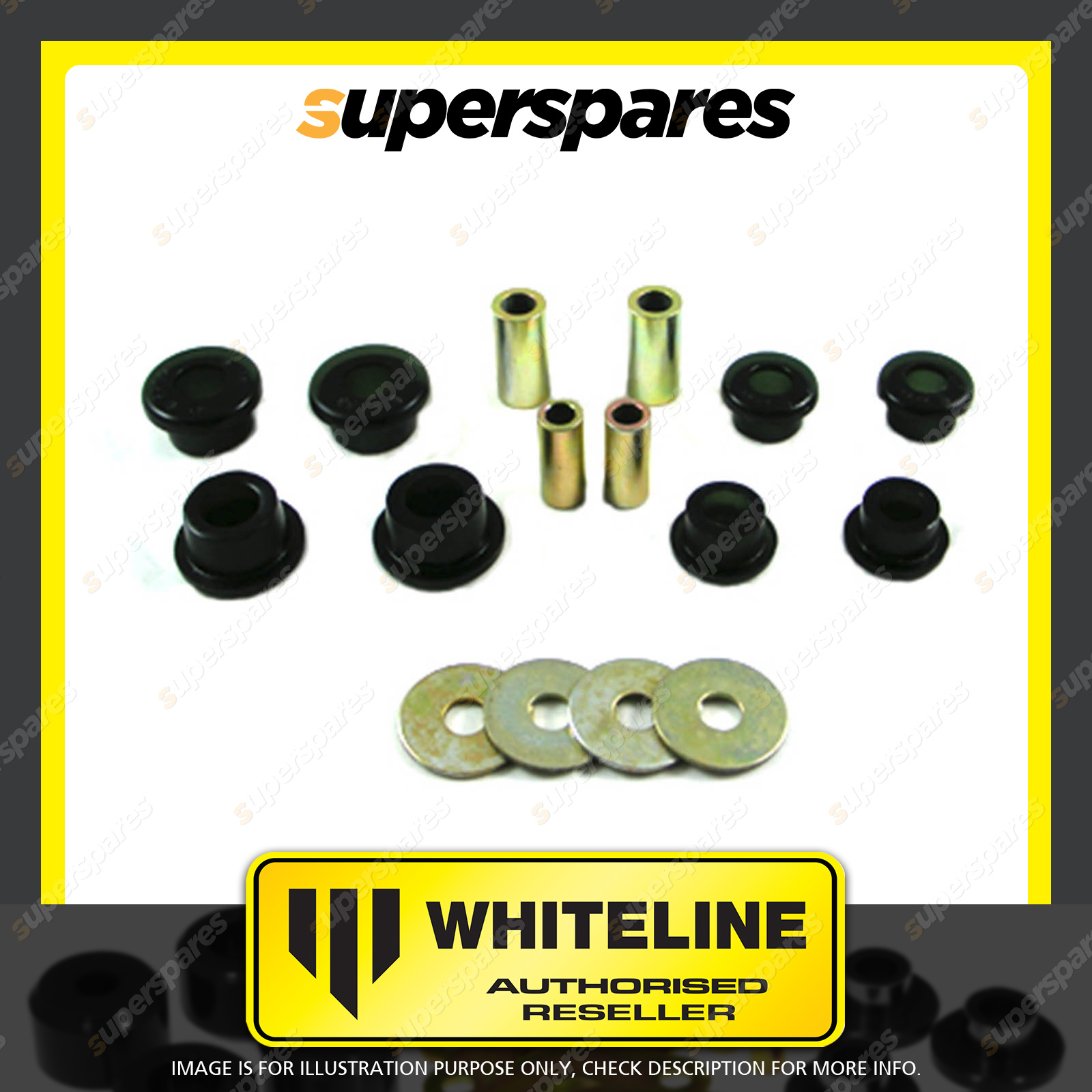 | Contents : Whiteline Front Sway bar - link bushing Warranty : 3 Year / 60,000Kms Kit Contents : 8 Bushings, 4 Tubes, 4 Washers, Grease |