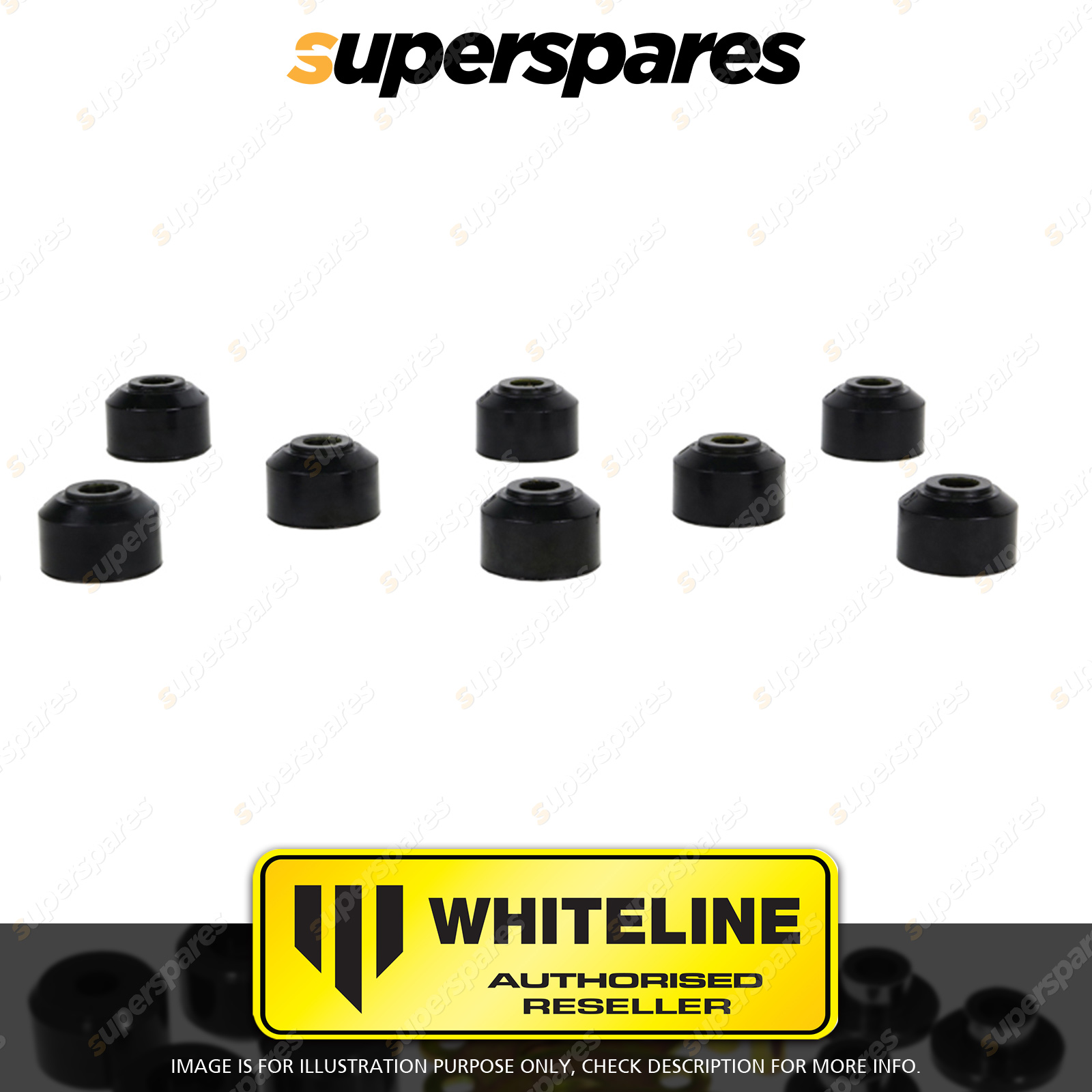 | Contents : Whiteline Front Sway bar - link bushing Warranty : 3 Year / 60,000Kms Kit Contents : 8 Bushings |