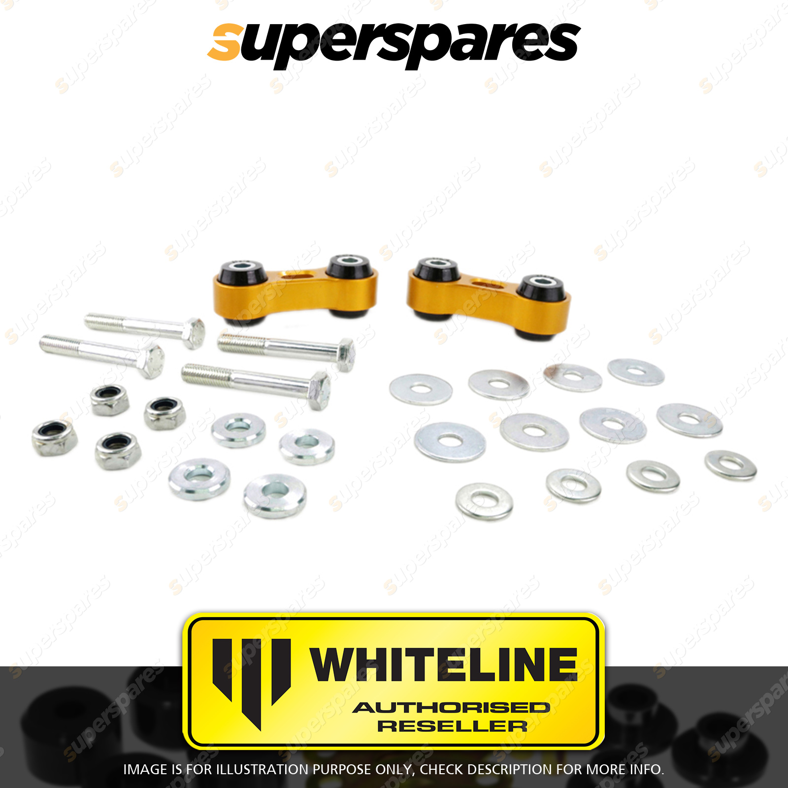 | Contents : Whiteline Front Sway bar - link Warranty : 3 Year / 60,000Kms Kit Contents : 2 Links, 4 Spacers, 4 Bolts, 12 Washers, 4 Nuts, Install Guide, Grease | Kit Specifications : Link Type : Bushing |