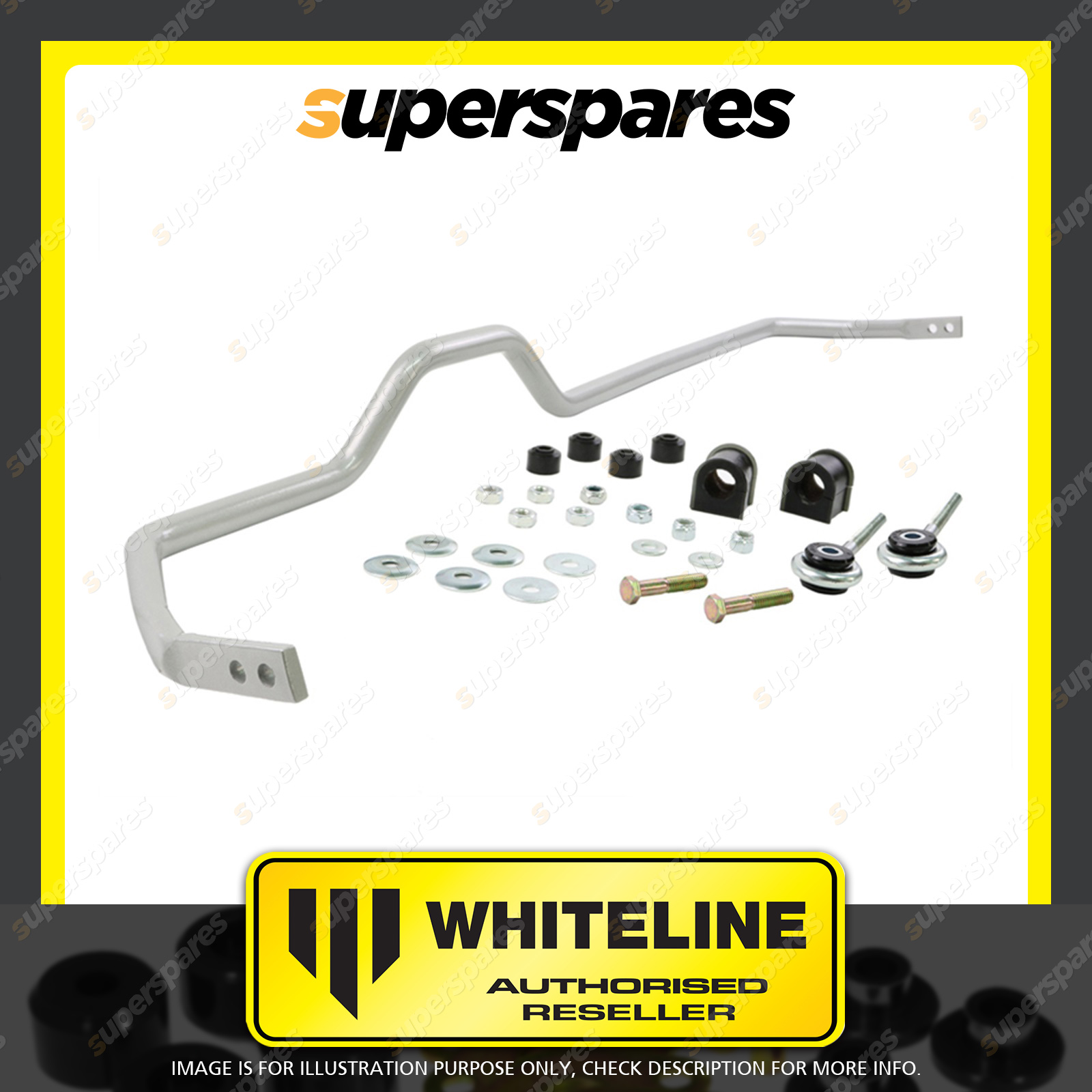 | Contents : Whiteline Rear Sway bar Warranty : 3 Year / 60,000Kms Kit Contents : 1 Sway Bar, 2 Links, 6 Bushings, 2 Bolts, 8 Washers, 8 Nuts, Install Guide, Grease | Kit Specifications : Diameter(mm) : 24mm |