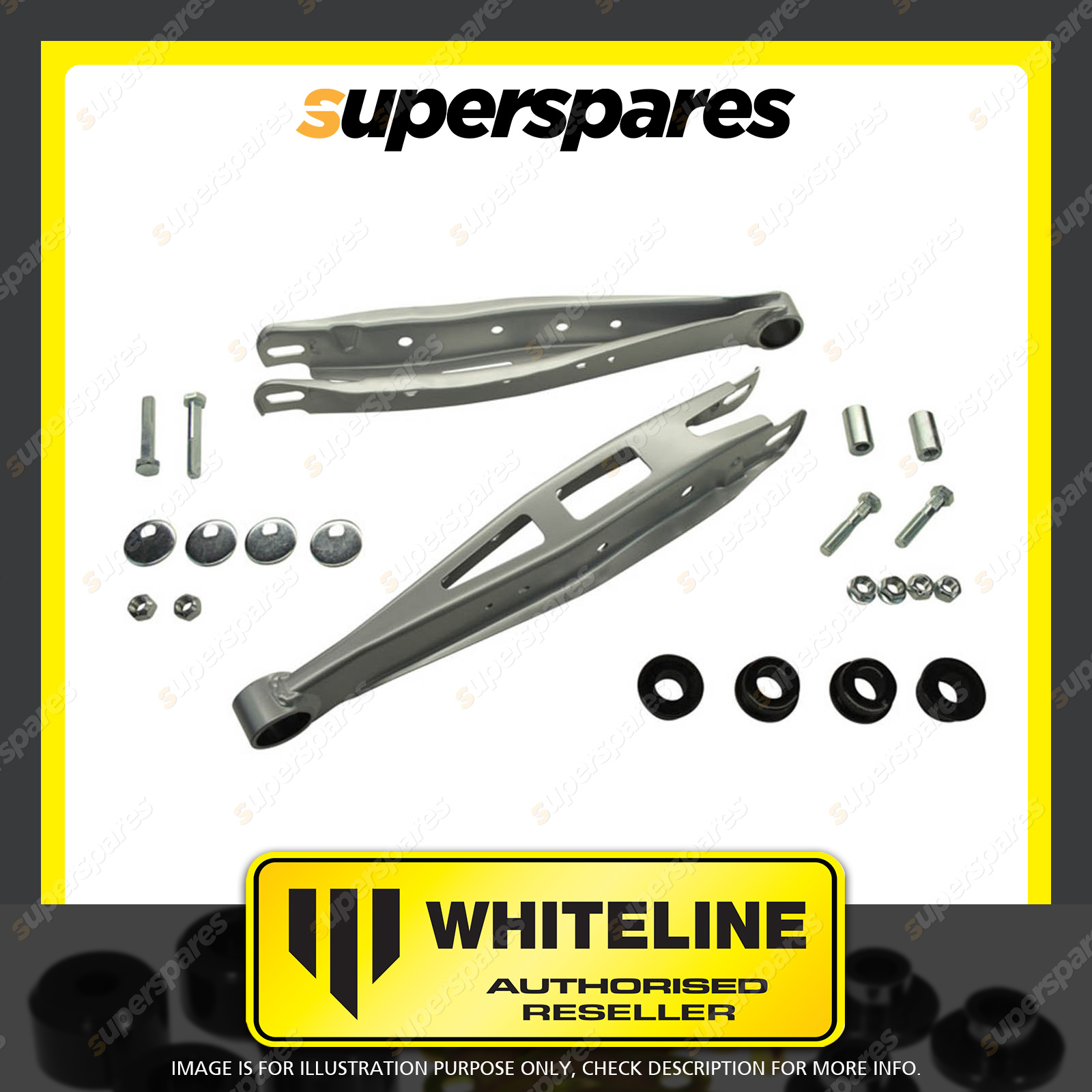 | Contents : Whiteline Rear lower Control arm Warranty : 3 Year / 60,000Kms Kit Contents : 2 Arms, 2 Bolts, 4 Washers, 2 Nuts, Install Guide |