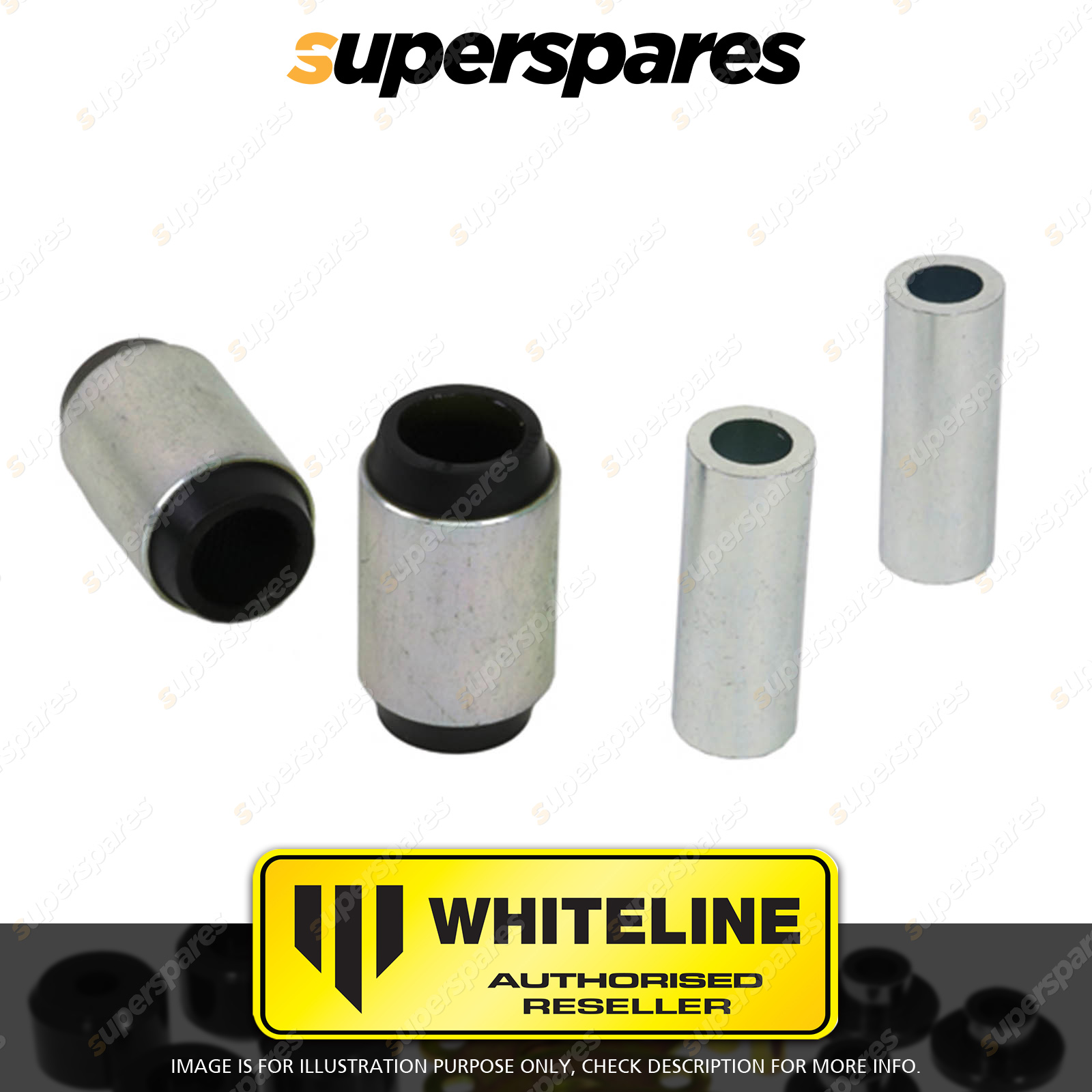 | Contents : Whiteline Rear Control arm - lower bushing Warranty : 3 Year / 60,000Kms Kit Contents : 2 Shell Bushings, 2 Tubes, Grease |