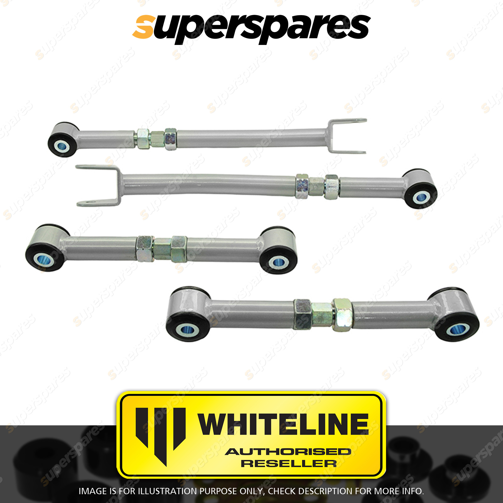 | Contents : Whiteline Rear Control arm - lower Front and Rear arm Warranty : 3 Year / 60,000Kms Kit Contents : 4 Arms, 8 Washers, Install Guide, Grease |