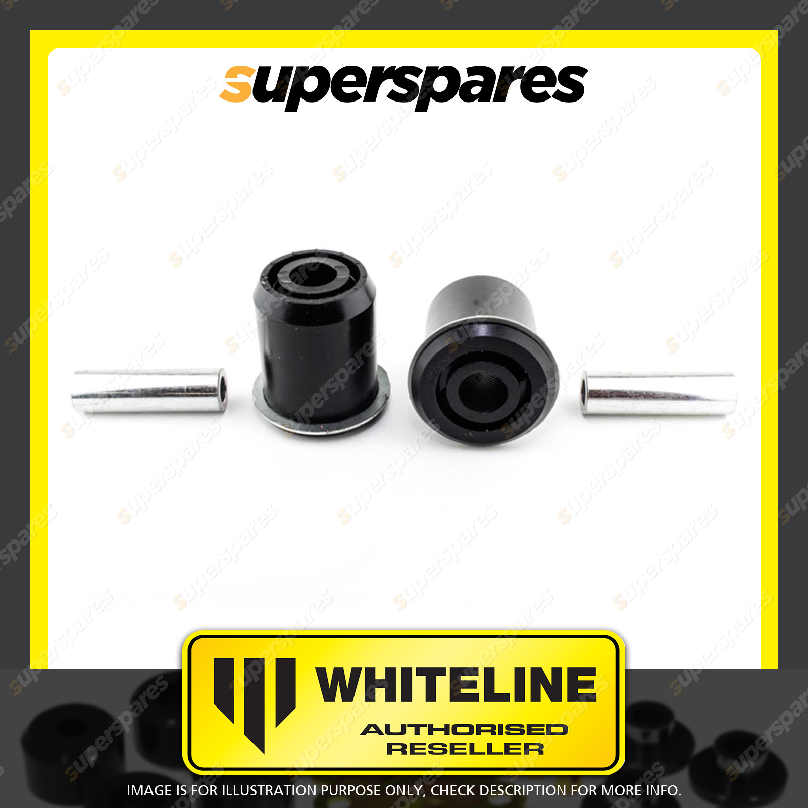 | Contents : Whiteline Rear Control arm - lower Front bushing Warranty : 3 Year / 60,000Kms Kit Contents : 2 Bushings, 2 Tubes, Install Guide, Grease |