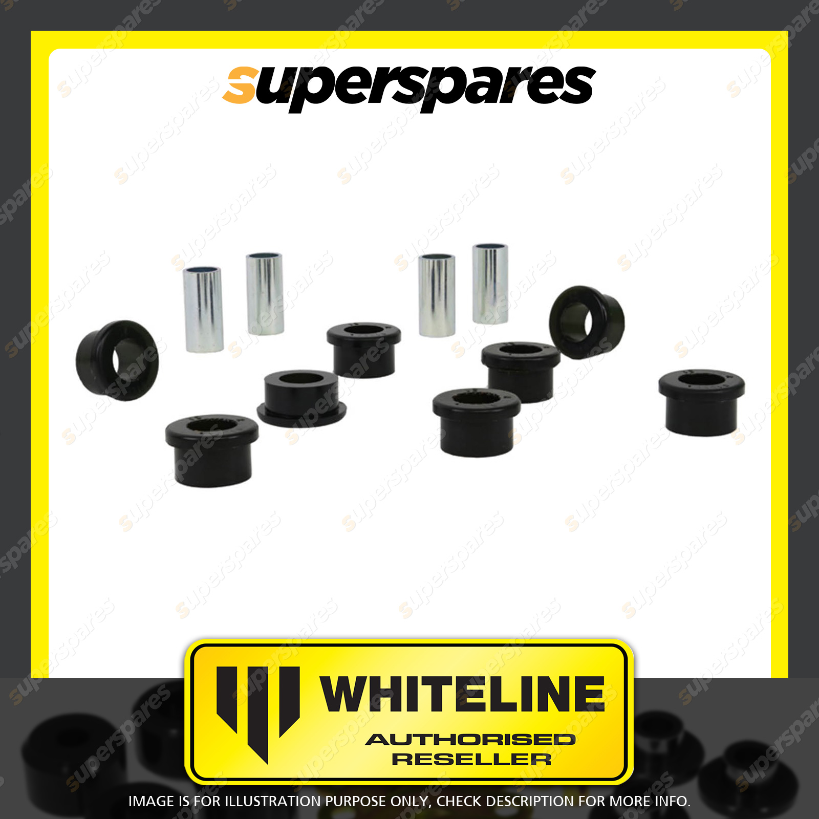 | Contents : Whiteline Rear Control arm - outer bushing Warranty : 3 Year / 60,000Kms Kit Contents : 8 Bushings, 4 Tubes, Grease |