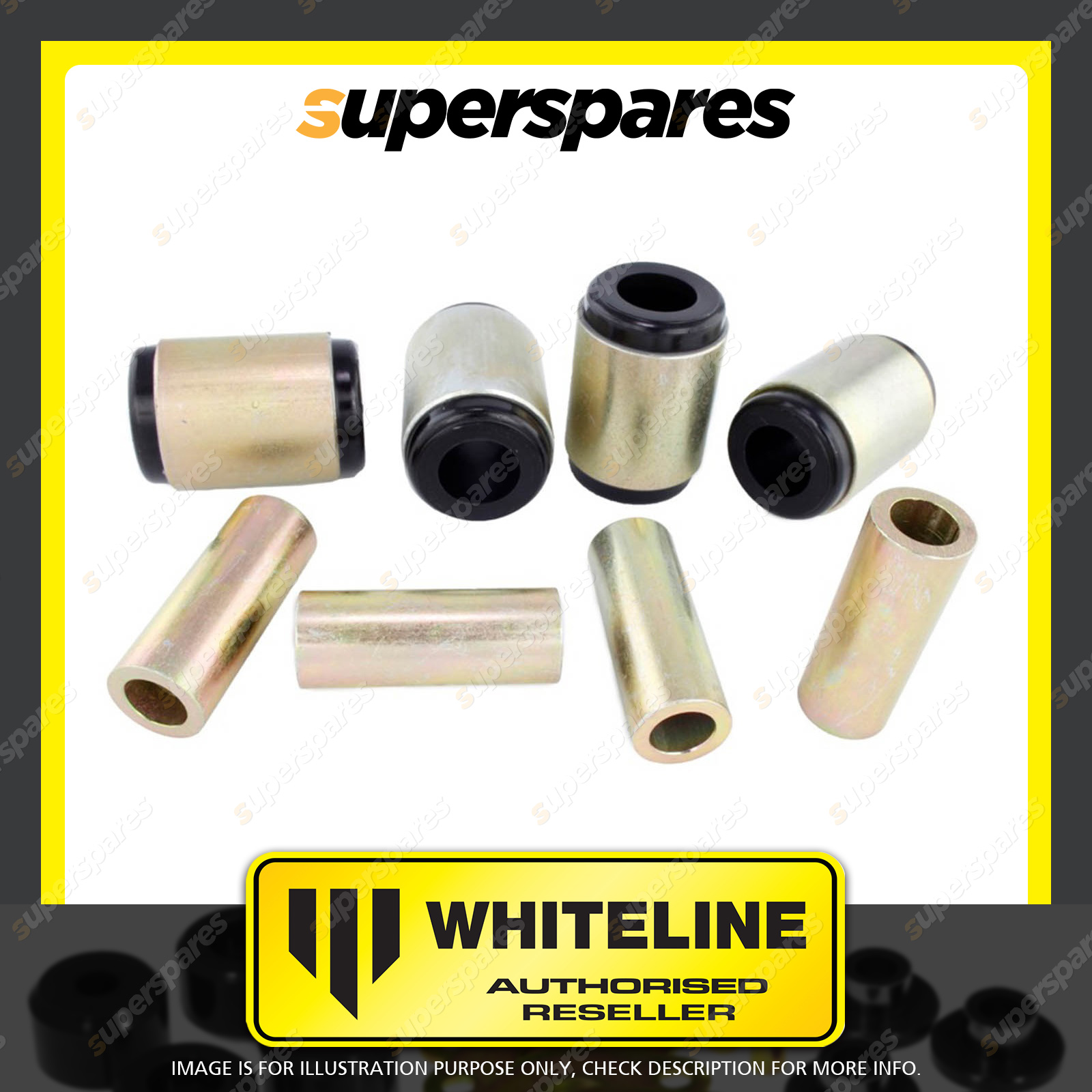 | Contents : Whiteline Rear Control arm - upper inner bushing Warranty : 3 Year / 60,000Kms Kit Contents : 4 Shell Bushings, 4 Tubes, Grease |
