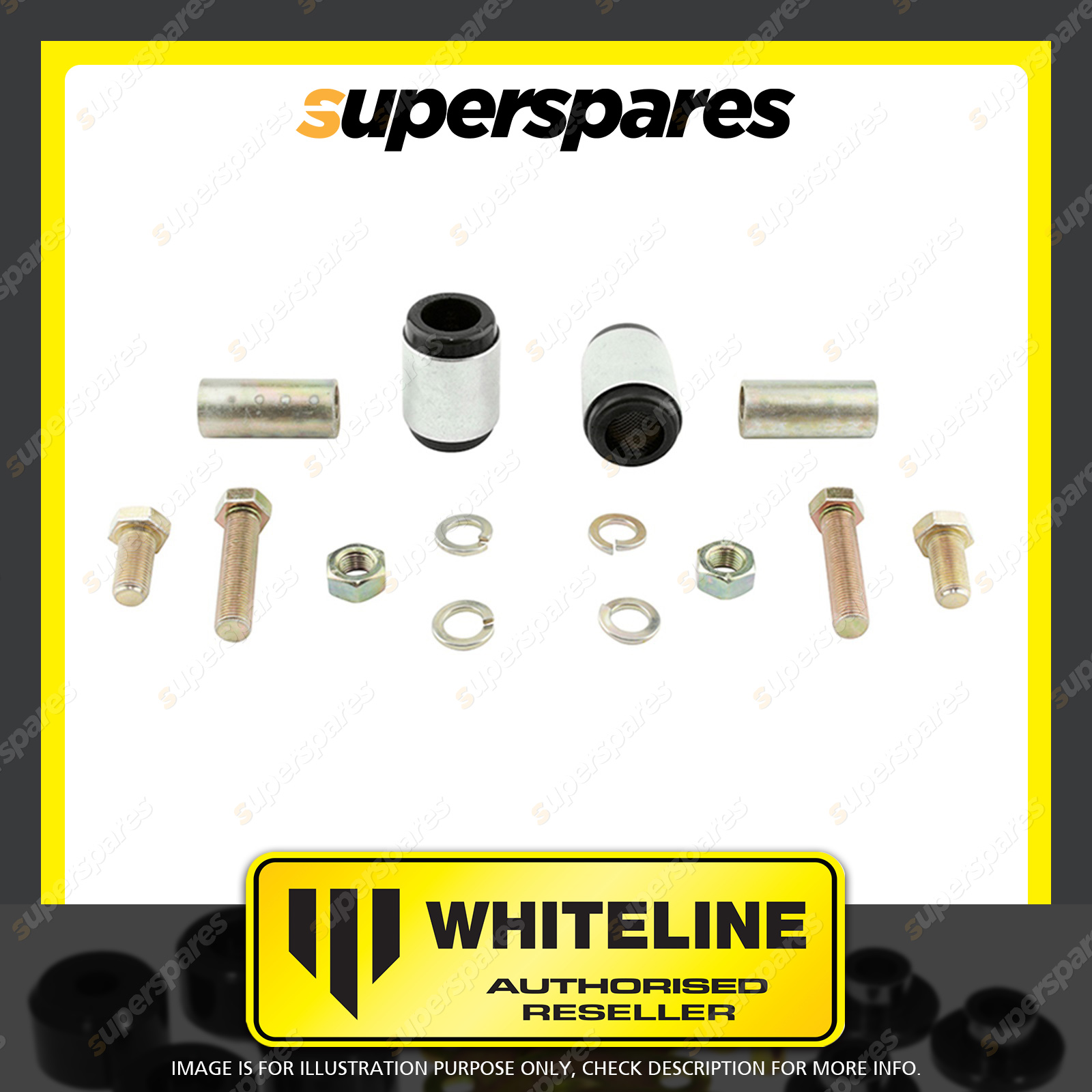 | Contents : Whiteline Rear Control arm - upper inner bushing Warranty : 3 Year / 60,000Kms Kit Contents : 2 Shell Bushings, 2 Tubes, 4 Bolts, 4 Washers, 2 Nuts, Install Guide, Grease | Kit Specifications : Bush Qty : 2 |